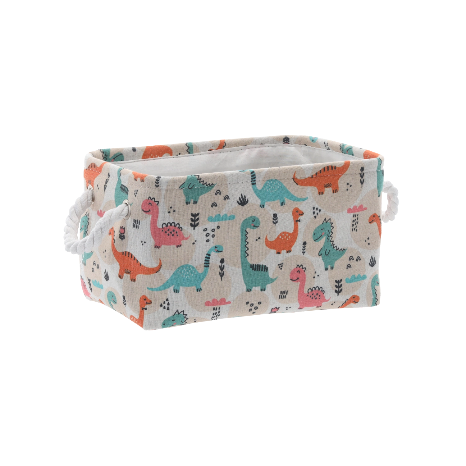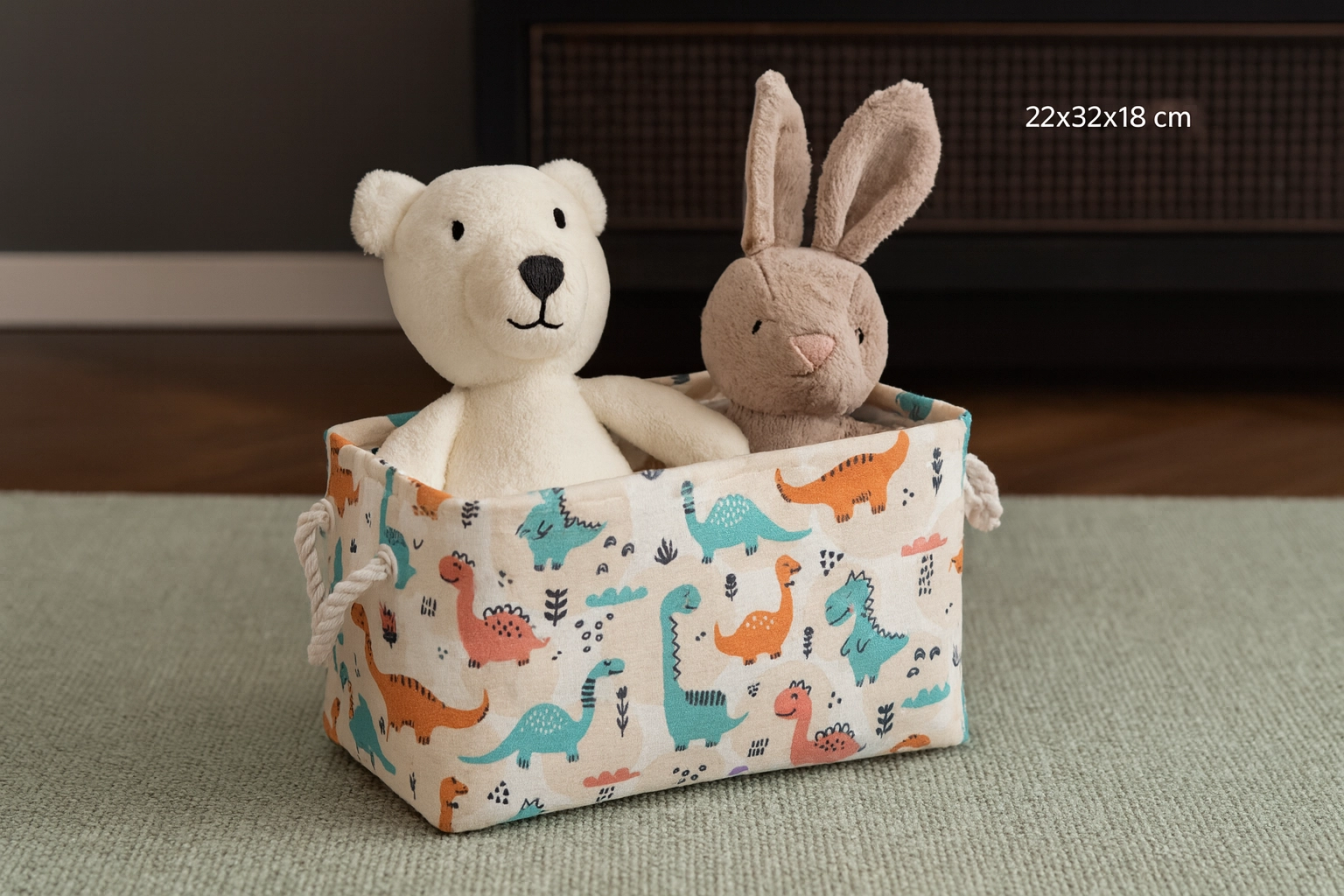 Stylový a praktický organizér na hračky s motivem dinosaurů pomůže rychle zkrotit nepořádek v dětském pokoji. Díky kompaktním rozměrům 22 × 32 × 18 cm se vejde na polici i do regálu, odolný polyester zajistí dlouhou životnost a nízká hmotnost pohodlné přenášení. Veselý potisk dinosaurů dodá interiéru hravost a barvy.