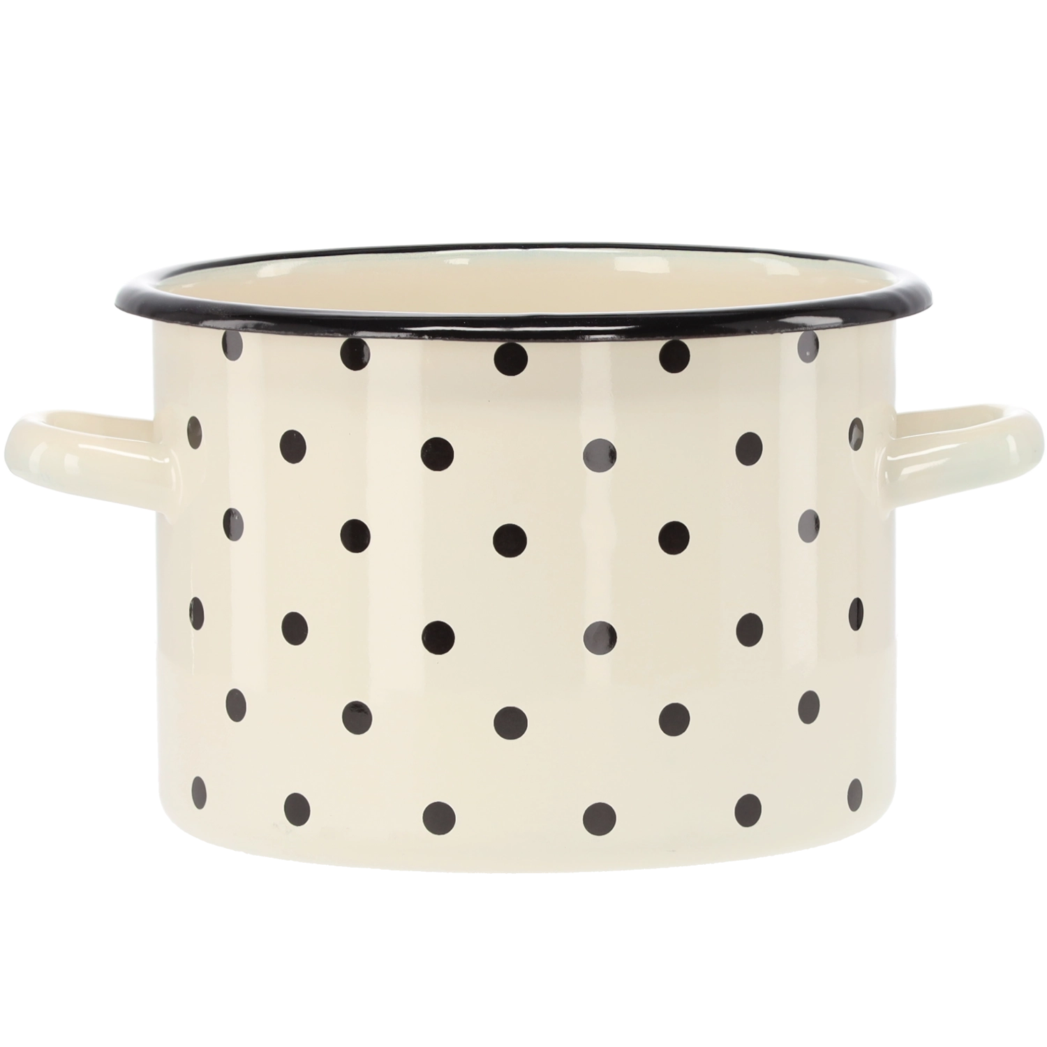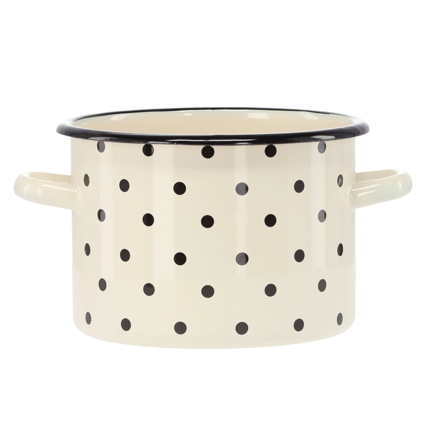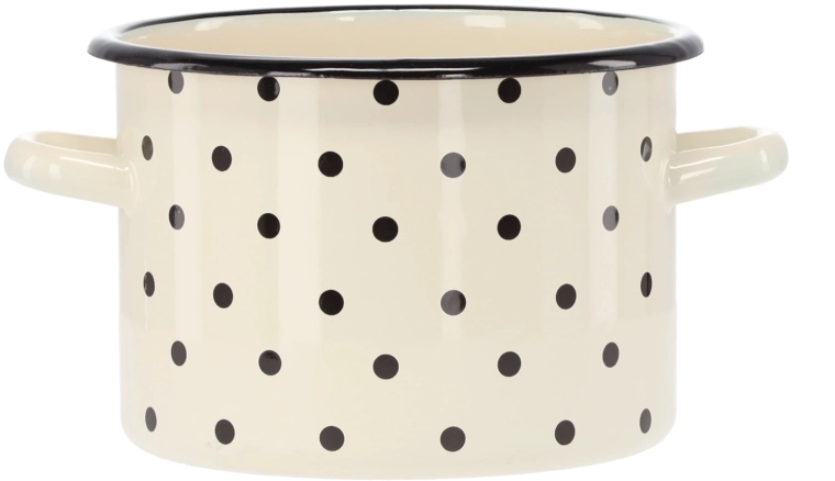 Stylový smaltovaný hrnec o objemu 3 l a průměru 18 cm v bílé barvě s dekorativními puntíky. Skvělý pro každodenní vaření, od polévek po omáčky, odolný povrch ze smaltu se snadno čistí a je hygienický.