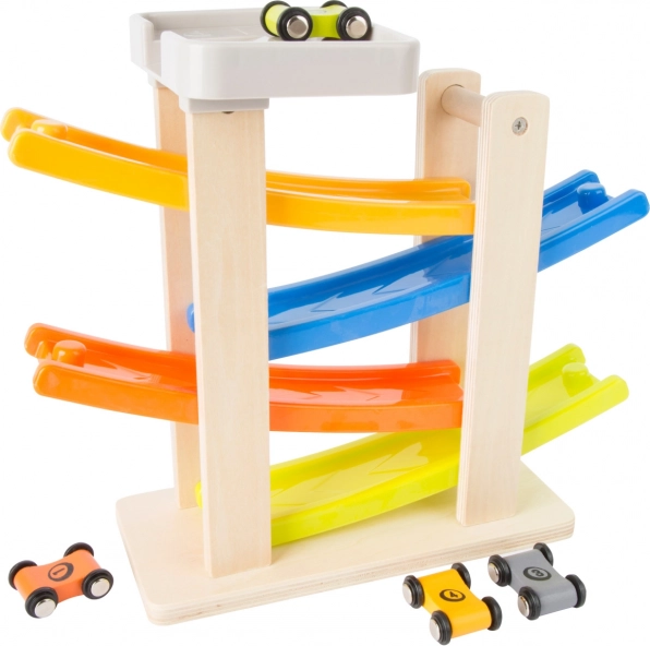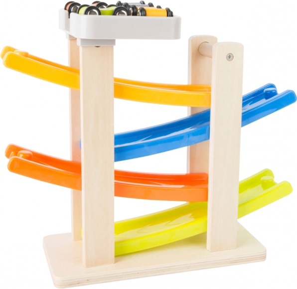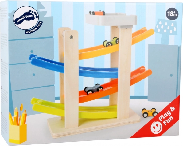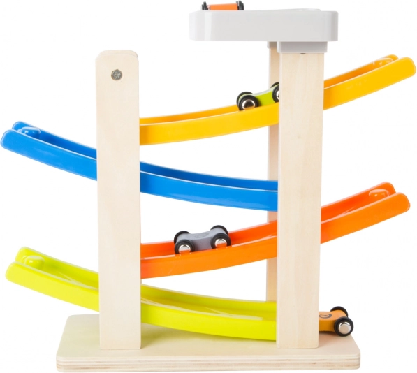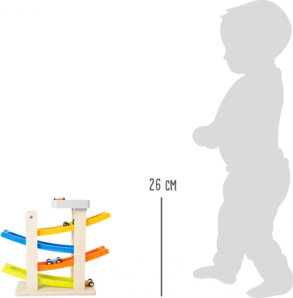 Zábavná dřevěná klip klap dráha s barevnými rampami a čtyřmi autíčky je skvělý způsob, jak rozvíjet motorické schopnosti a koordinaci dětí. Stabilní základna a moderní barevné provedení zajišťují, že se dráha stane oblíbeným doplňkem každého dětského pokoje.