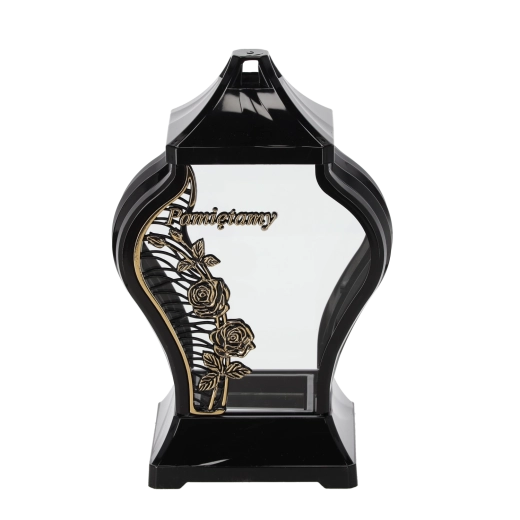 Designový lampion v černo‑zlatém provedení s decentním motivem pnoucí růže je ideální volbou pro ty, kdo hledají elegantní a vkusnou ozdobu na hrob. Výška 30 cm zajišťuje dobrou viditelnost i stabilitu, zatímco nadčasová kombinace barev podtrhuje důstojný charakter místa posledního odpočinku.