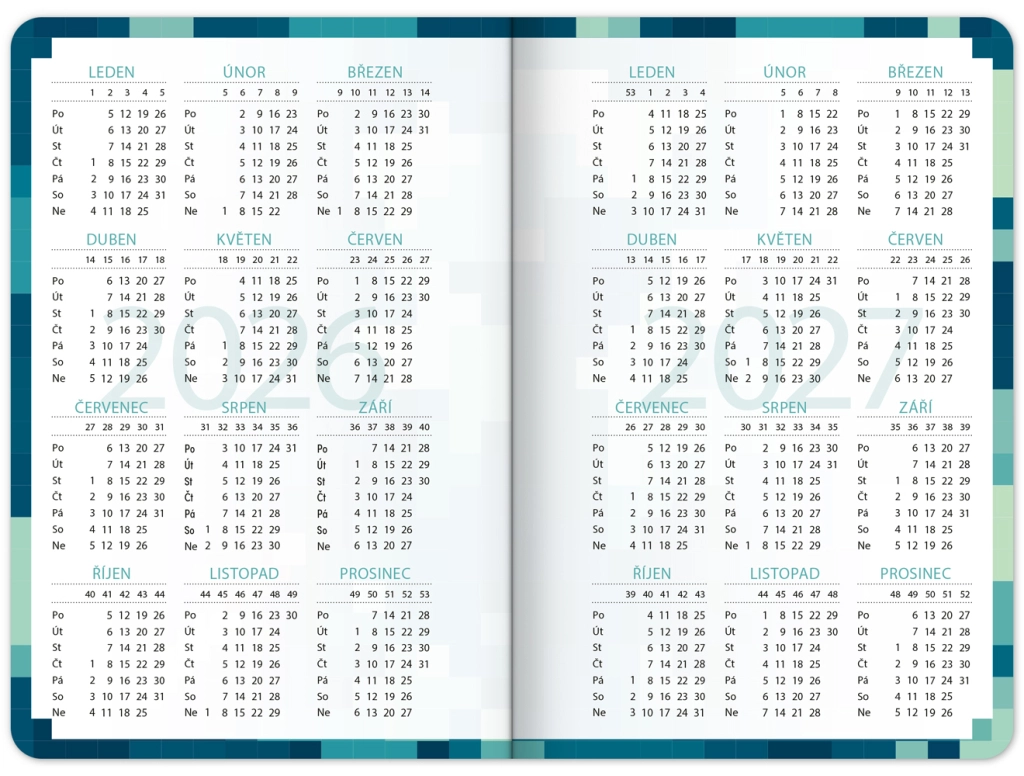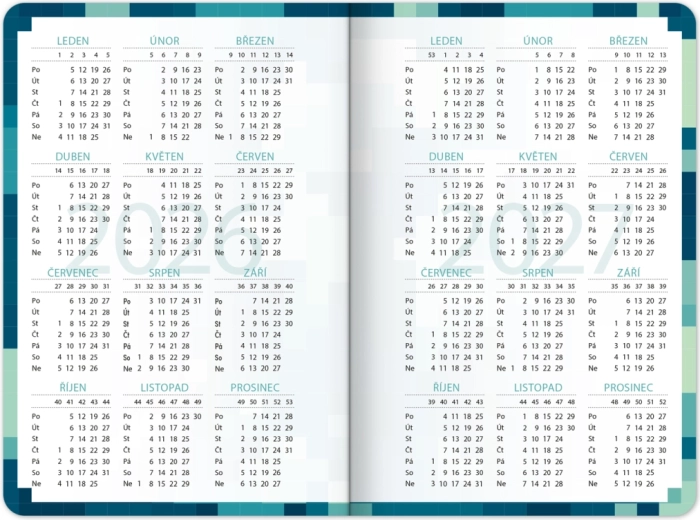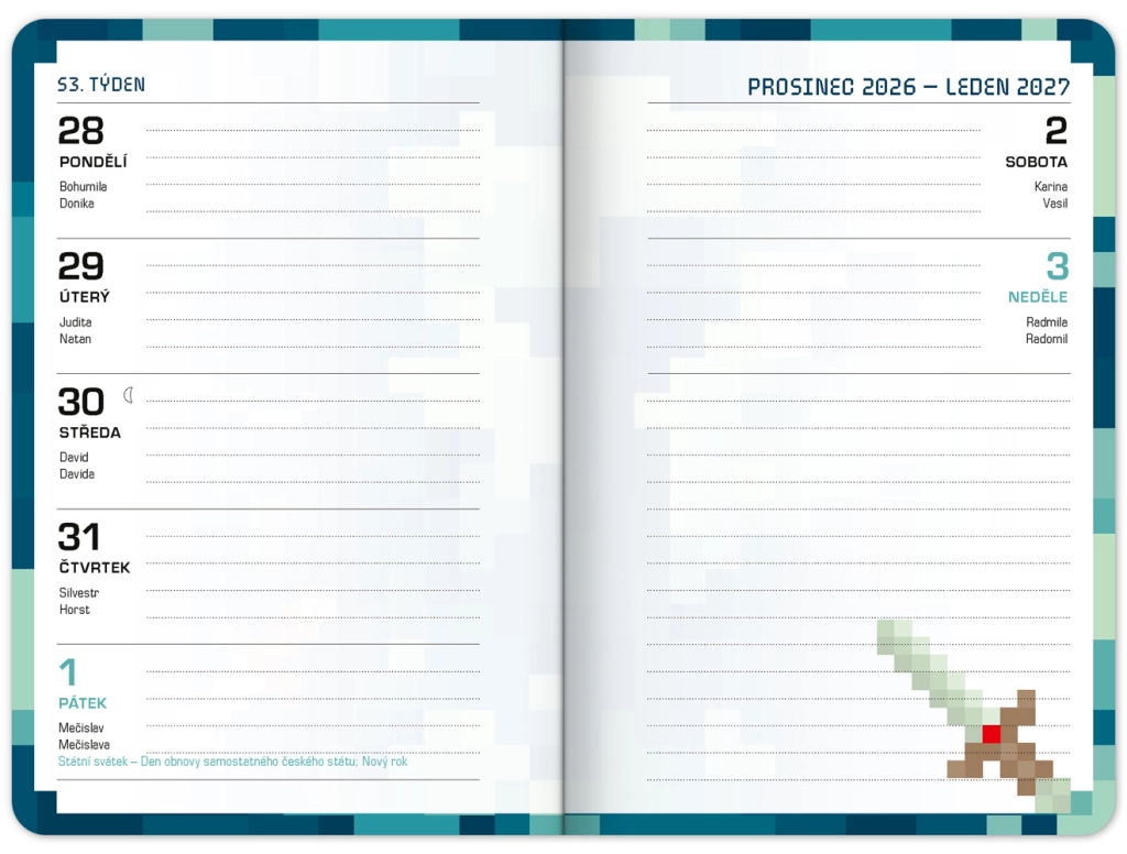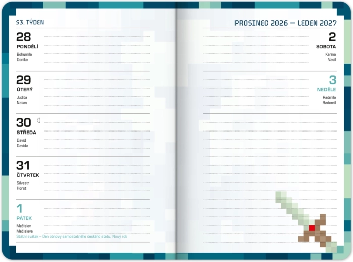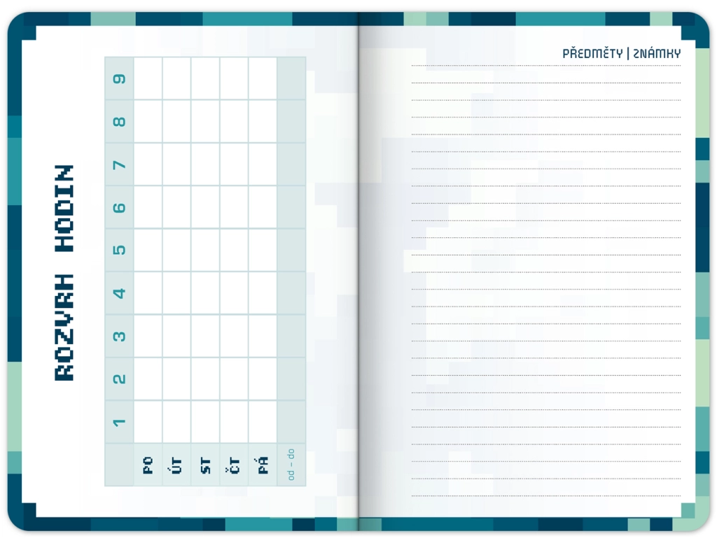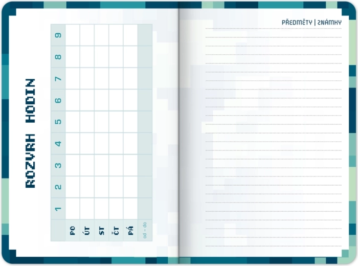 Stylový školní diář s motivem stavební videohry pro přehledný školní rok od září 2026 do prosince 2027. Nabízí praktické taháky z češtiny, matematiky a angličtiny, rozvrhy hodin a přehled prázdnin v kompaktním formátu 9,8 × 14,5 cm – ideální do batohu i tašky.