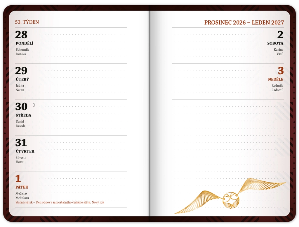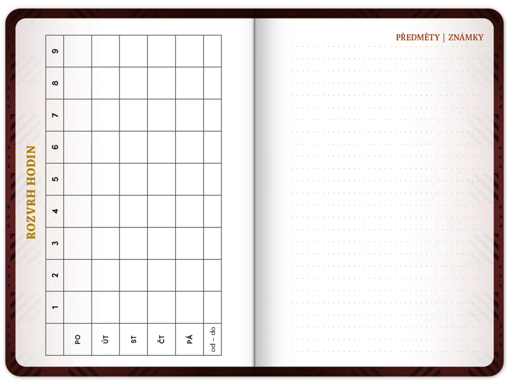 Stylový studentský diář s motivem HARRY POTTER pro školní rok od září 2026 do prosince 2027 v kompaktním formátu 9,8 × 14,5 cm. Nabízí praktické taháky z matematiky, fyziky, chemie a angličtiny, přehledné rozvrhy hodin a termíny prázdnin – ideální pro větší školáky a studenty, kteří chtějí mít vše pod kontrolou.