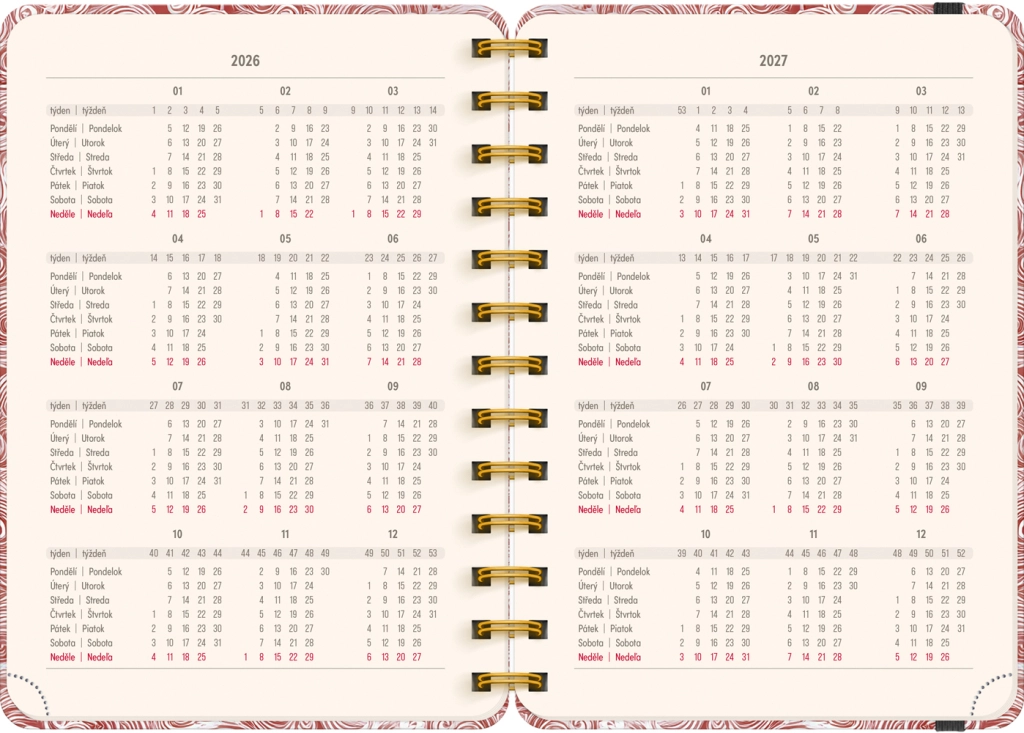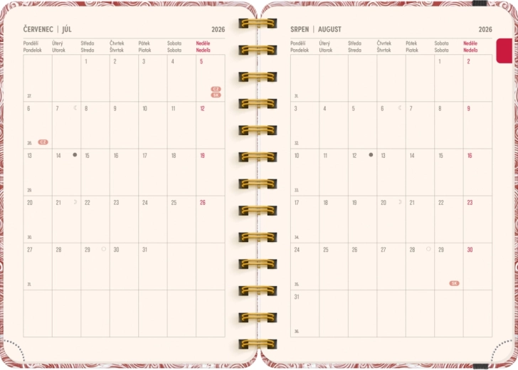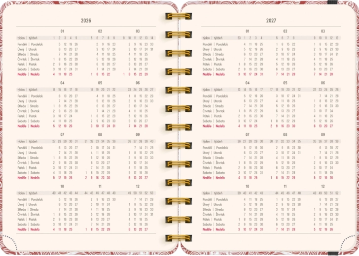 Diář obsahuje vše, co potřebujete pro efektivní organizaci času: roční přehledy 2026 a 2027, seznam českých a slovenských jmen a dostatek místa na poznámky v každém týdnu. Motiv Mraky dodá vašim plánům lehkost a přehlednost.