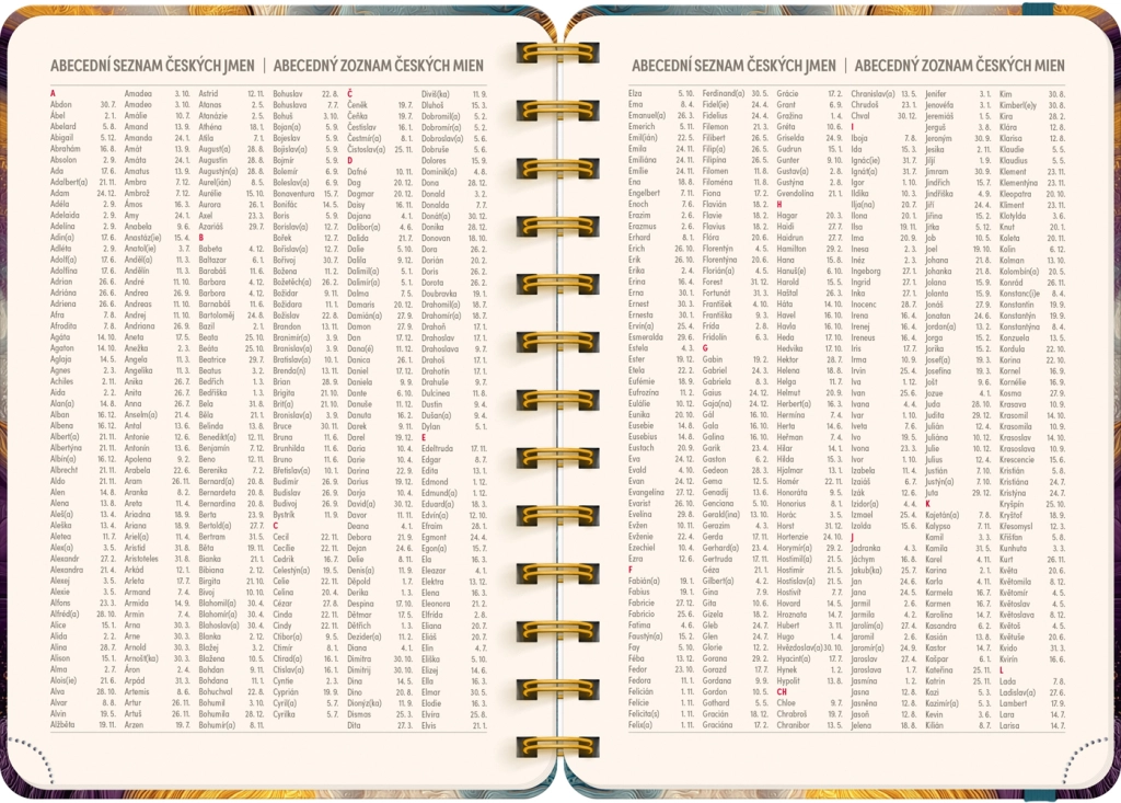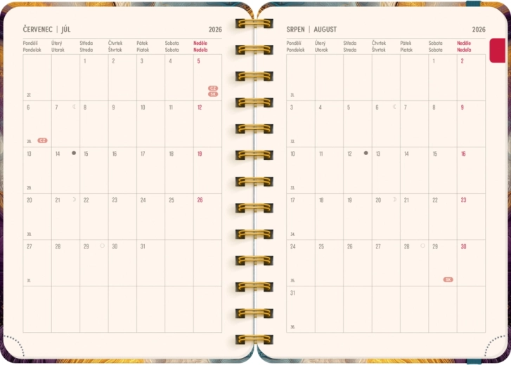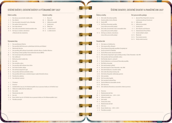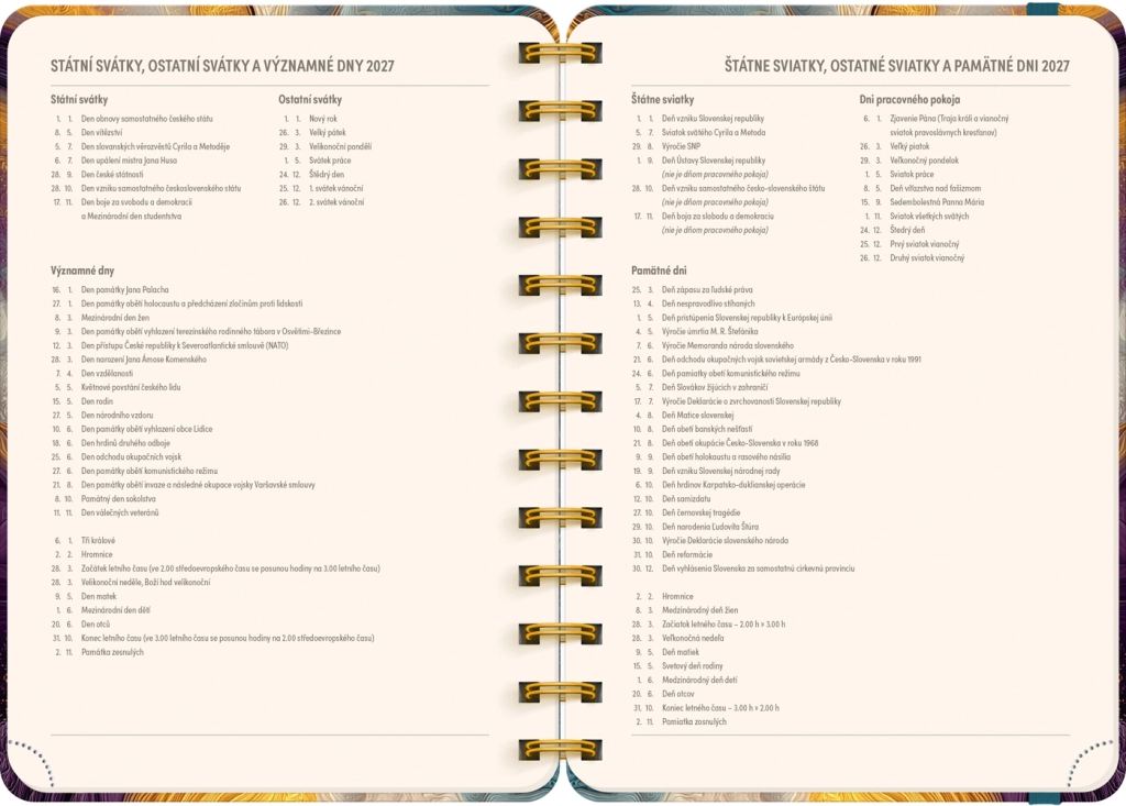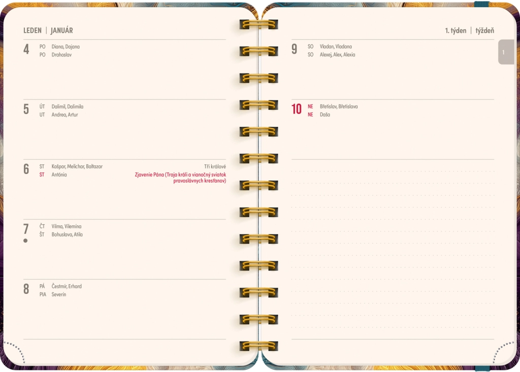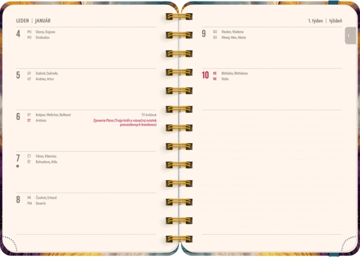 Kalendárium je česko‑slovenské, přehledné a doplněné o jmenné seznamy, takže budete mít vždy po ruce svátky a jména. Každý týden obsahuje vyhrazený prostor na poznámky, abyste si mohli zapisovat priority, úkoly i důležité termíny.