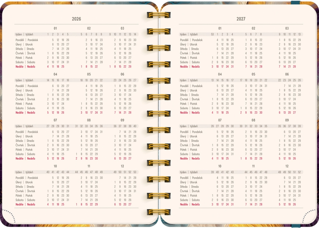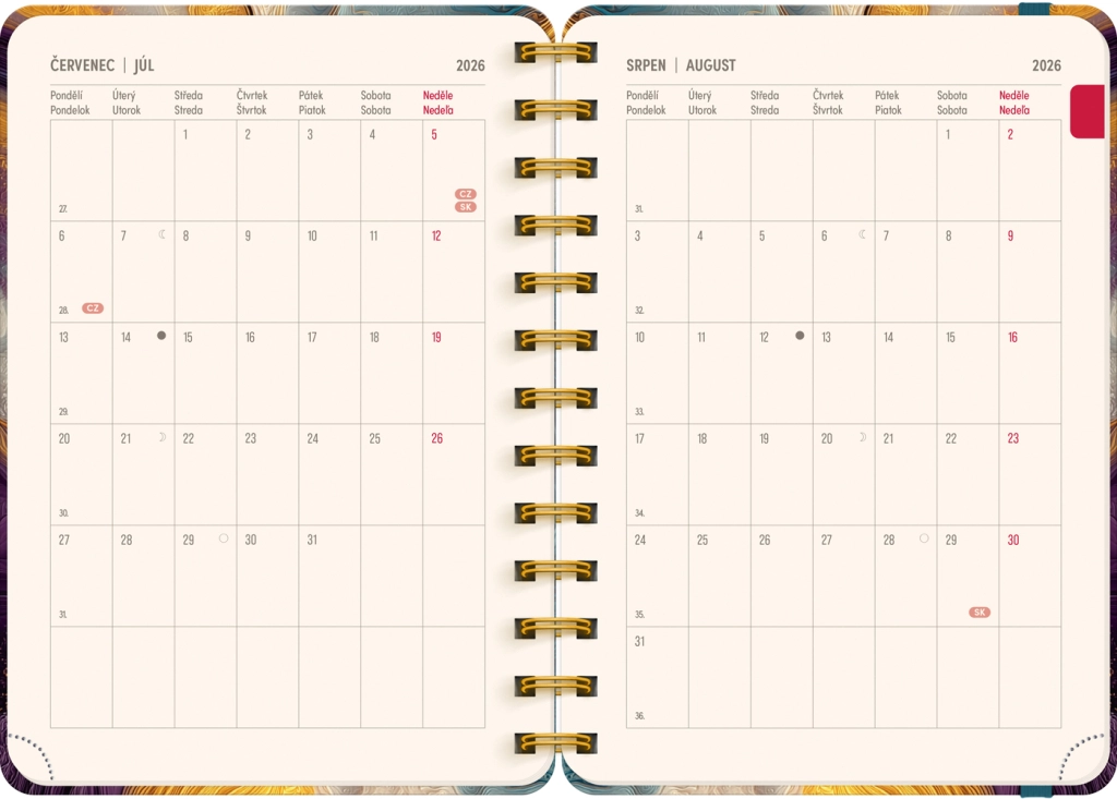 Praktický 18měsíční diář ve formátu 13 × 18 cm spojuje elegantní motiv barevného achátu s přehledným týdenním plánováním. Nabízí česko‑slovenské řádkové kalendárium se jmény a svátky, prostor na poznámky každý týden a přehled na roky 2026 a 2027. Začíná v červenci 2026 a končí v prosinci 2027.