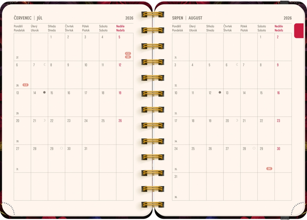 Diář pokrývá období od července 2026 do prosince 2027 a nabízí vše, co od každodenního plánovače očekáváte: rychlé roční přehledy, prostor pro poznámky a jasně členěné týdny. Kompaktní formát 13 × 18 cm se vejde do kabelky i batohu, takže plánování máte vždy po ruce.