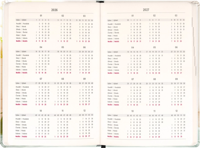 - Týdenní sloupcové kalendárium: rychlá orientace a dostatek místa na poznámky