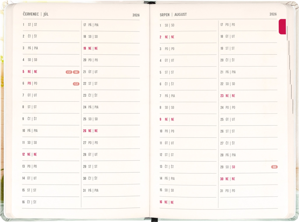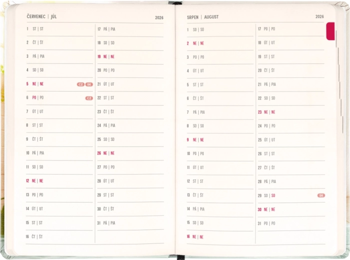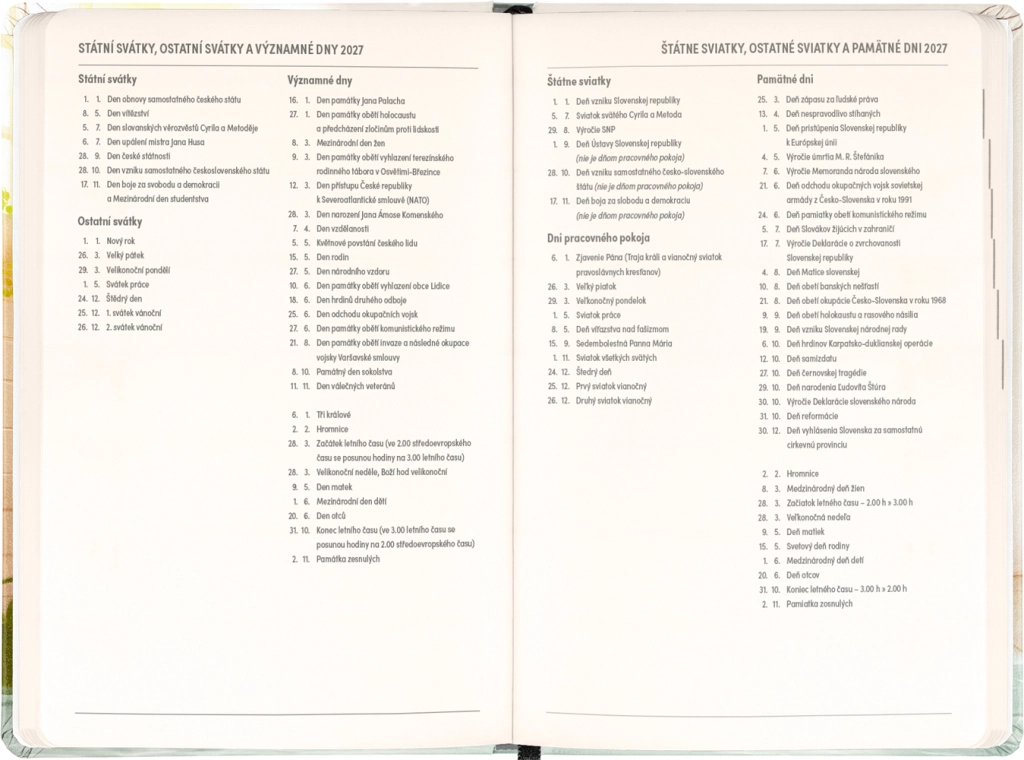 Diář potěší každého, kdo ocení kombinaci funkčnosti a hravého designu. Česko‑slovenské kalendárium se jmény a svátky zjednodušuje plánování a pomáhá nezapomenout na důležité dny.