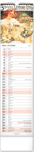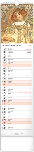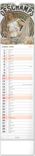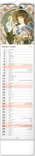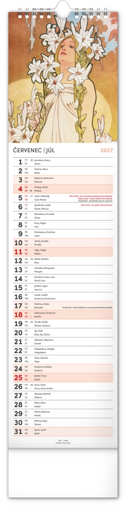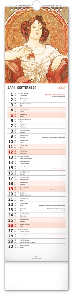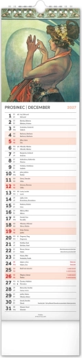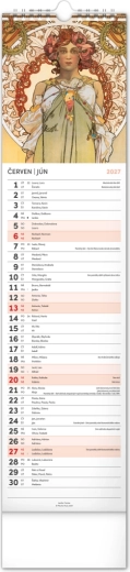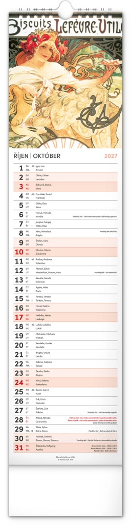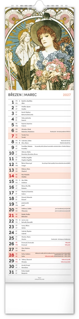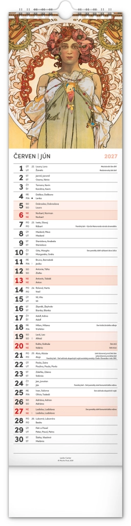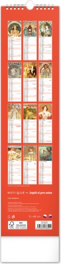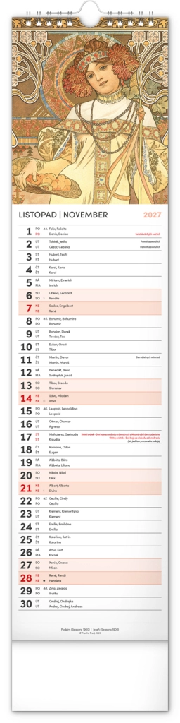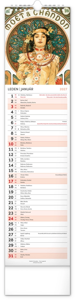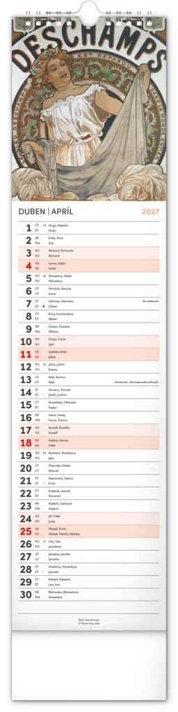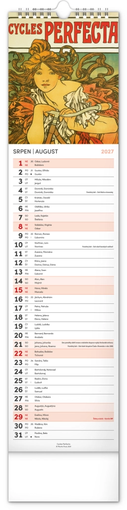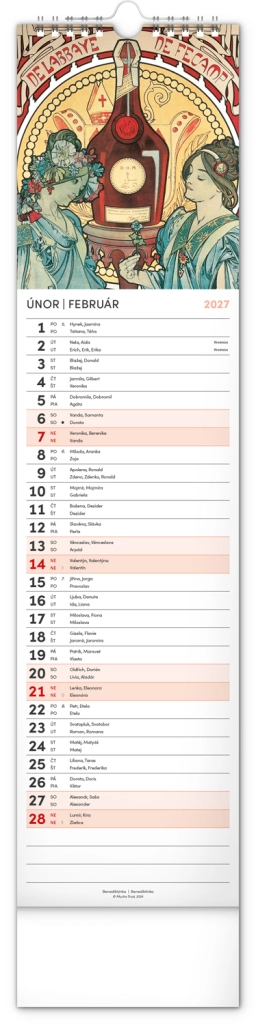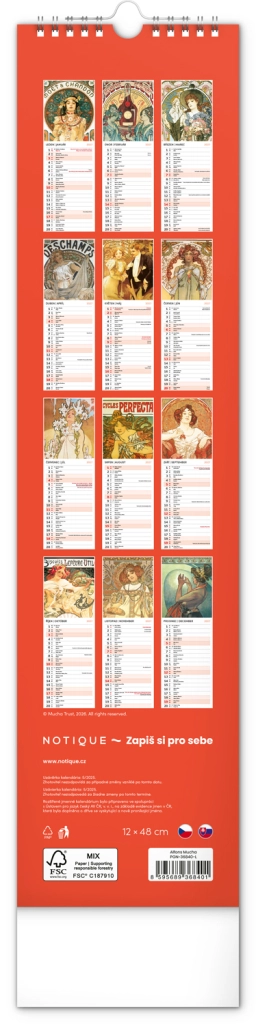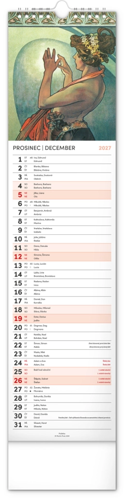Elegantní česko‑slovenský nástěnný kalendář v kravatovém formátu s nadčasovými reprodukcemi děl Alfonse Muchy. Ideální pro milovníky secesního umění, domov i kancelář. Praktický vertikální formát 12 × 48 cm šetří místo a poskytuje přehledné plánování na celý rok 2027.
