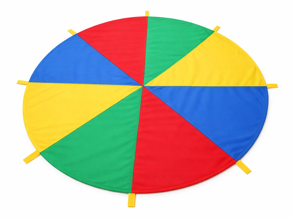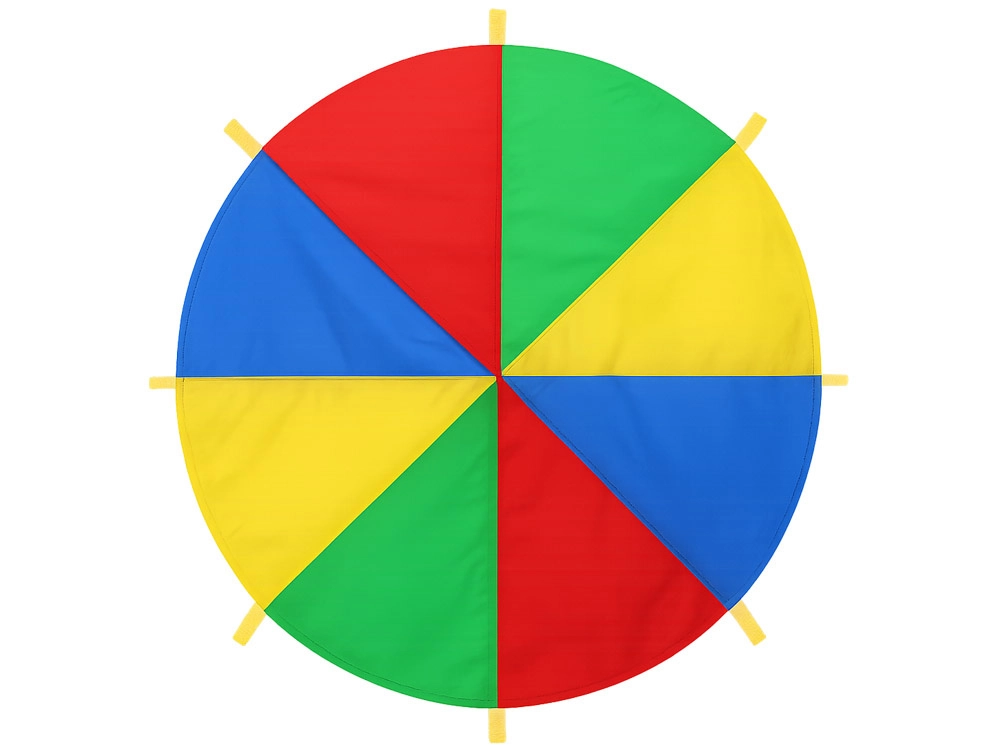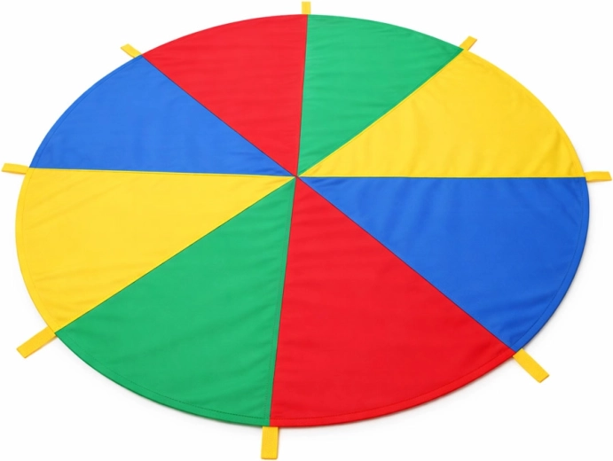 Odolná textilie v červené, modré, zelené a žluté barvě je po obvodu doplněna praktickými držadly pro pevný úchop. Padák je perfektní pro aktivity jako vlnění, výměny míst, vyhazování míčku či hry na barvy – a to uvnitř i venku.