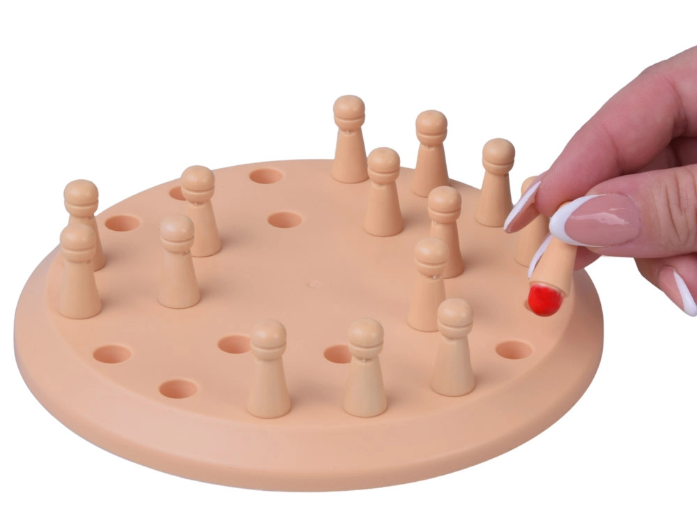 Barevné konce kolíčků skryté v otvorech nutí hráče zapamatovat si pozice a barvy. Ideální cvičení kognitivních dovedností formou hry.