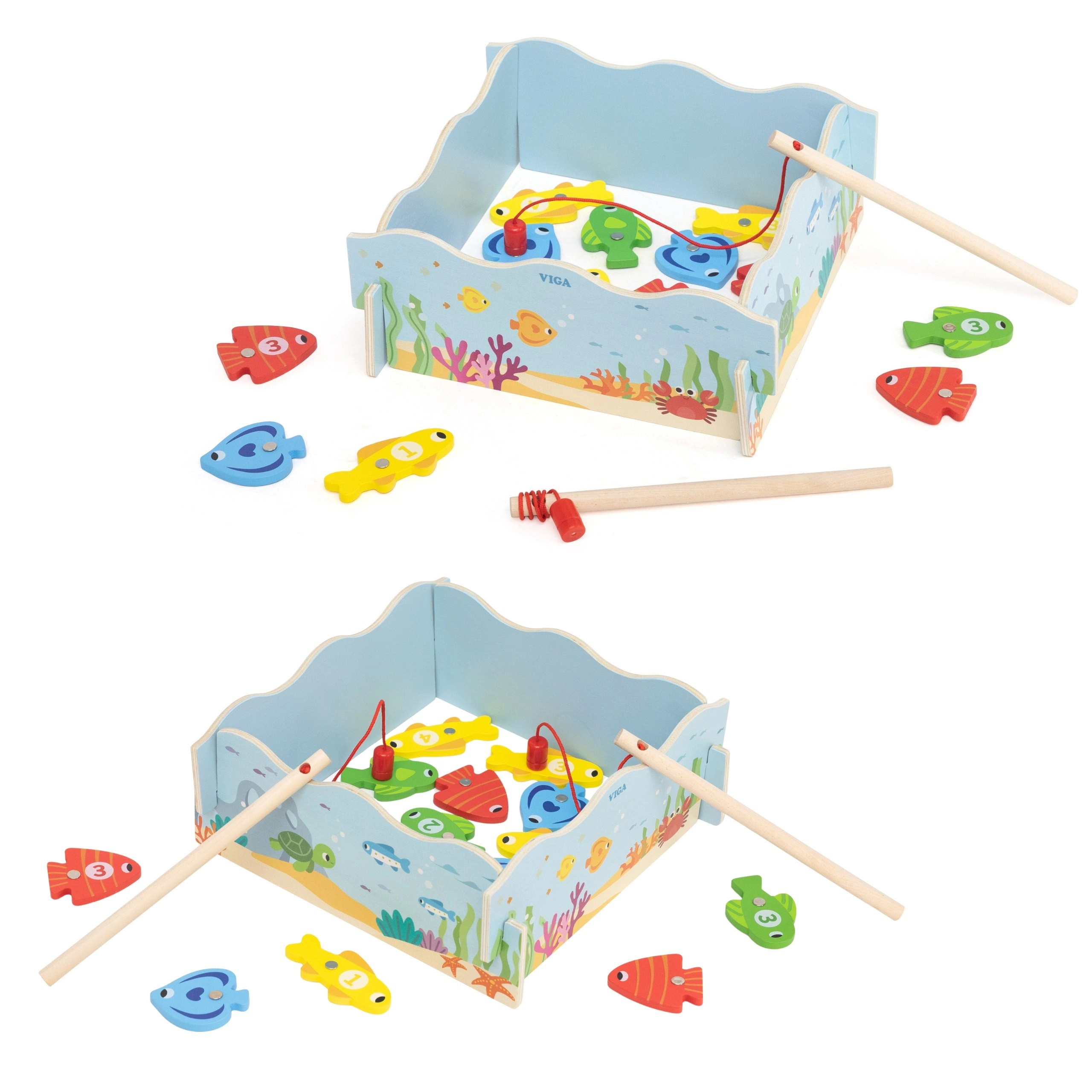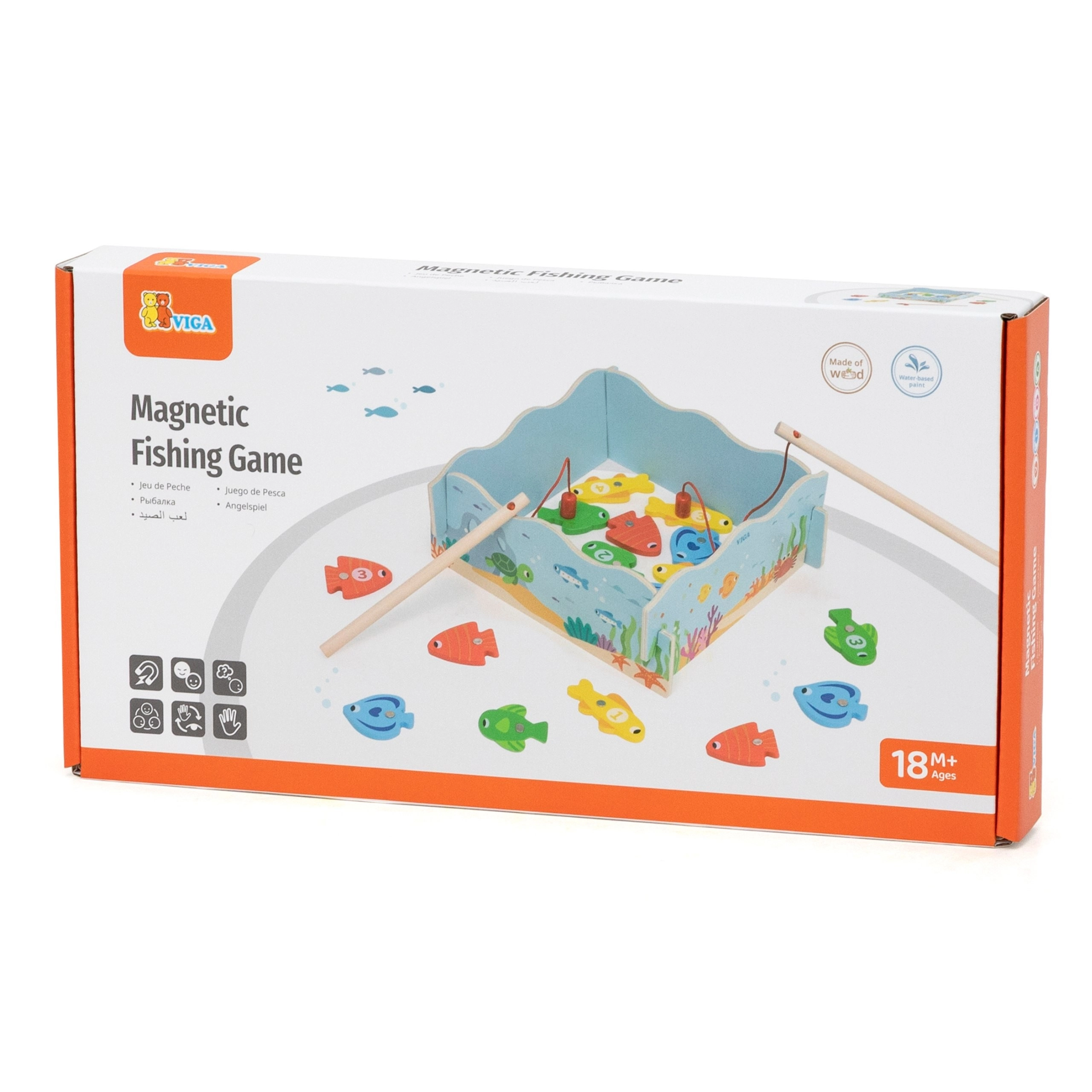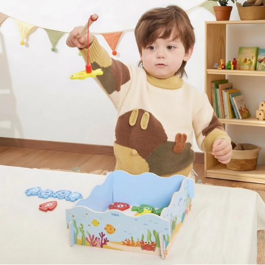 Dopřejte dětem chytrou zábavu, která spojuje hru a učení. Dřevěná magnetická hra rybaření VIGA obsahuje barevné rybičky s čísly a dvě magnetické udice, díky nimž děti trénují přesnost pohybu a soustředění. Krabice se promění v modrý „rybníček“, po hře vše snadno uklidíte.