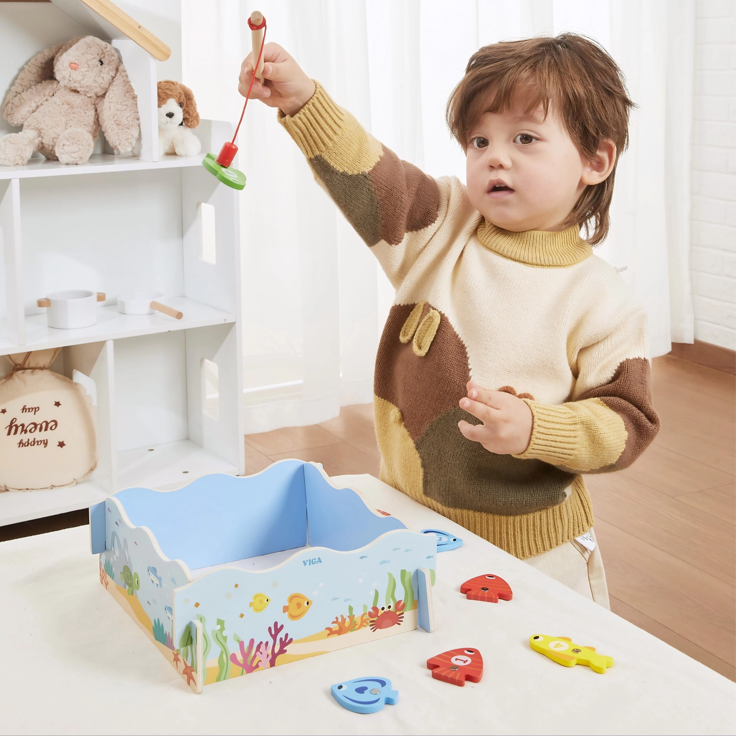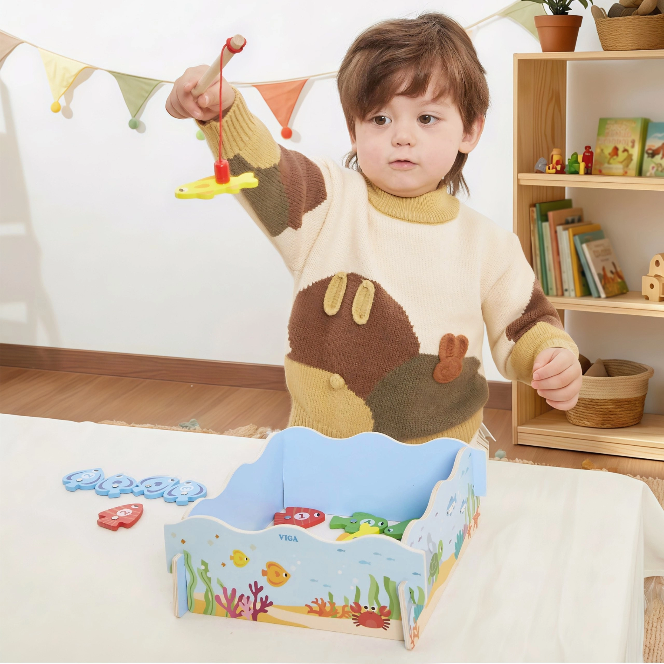 Chyťte barevné rybky a učte se hrou! Dřevěná magnetická hra od VIGA nabízí bezpečné magnetické rybaření, čísly označené rybičky pro učení čísel a barev a pevnou dřevěnou konstrukci. Ideální pro děti od 18 měsíců, rozvíjí jemnou motoriku, koordinaci oko–ruka a trpělivost. Praktický „rybníček“ slouží i jako úložná krabice.