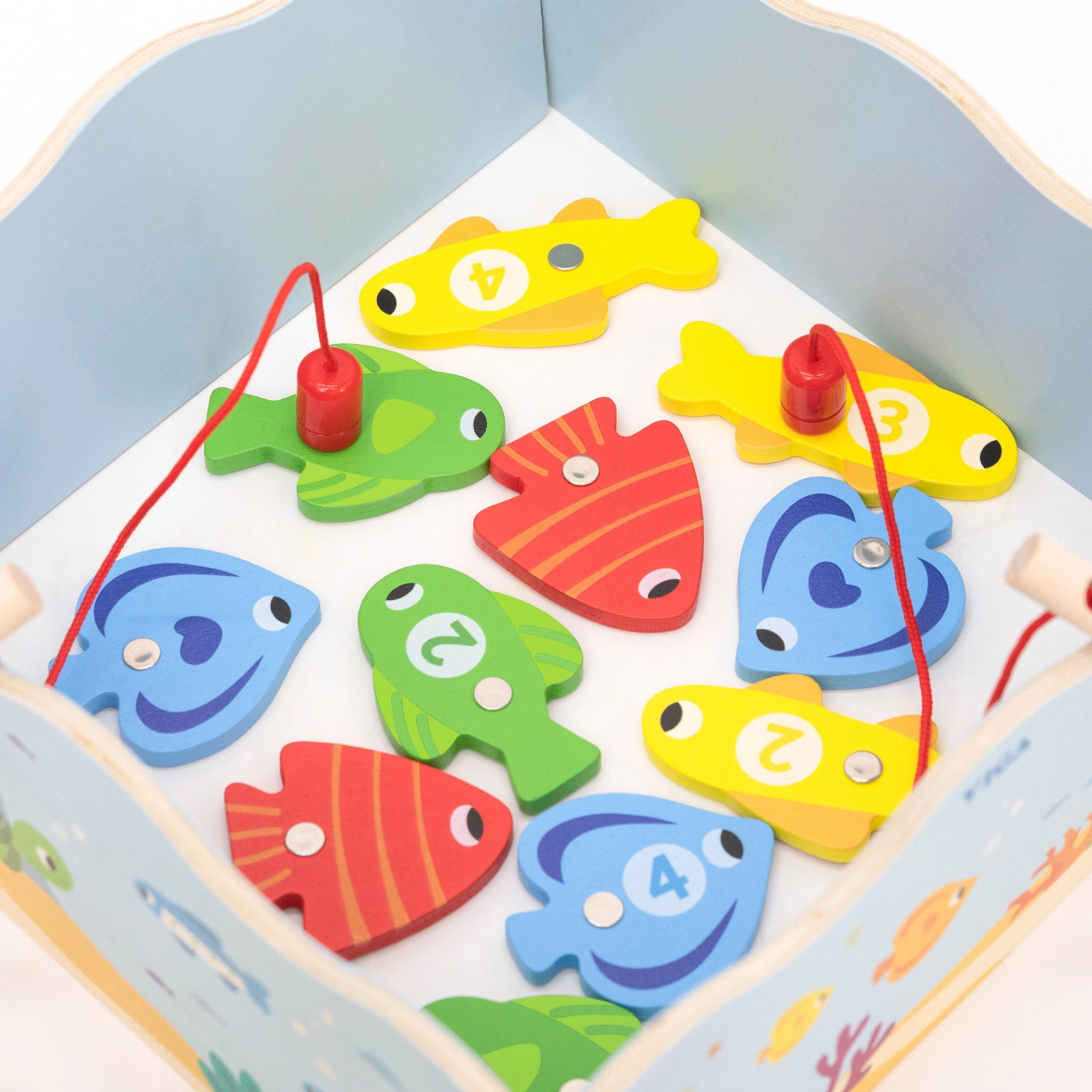 Každá dřevěná rybka je barevná a označená číslem – děti přirozeně trénují počítání a rozlišování barev.