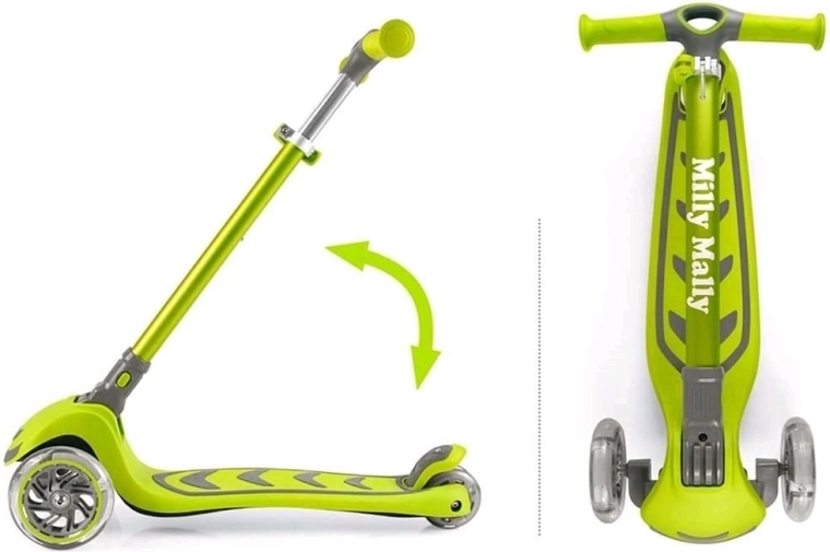 Lehká a odolná dětská koloběžka Milly Mally Boogie v zelené barvě potěší malé jezdce od 3 let. Nabízí stabilní tříkolové provedení s dvojitým zadním kolečkem, svítícími předními kolečky a hliníkovou konstrukcí pro dlouhou životnost. Řízení nakláněním těla, výškově nastavitelná řídítka a protiskluzová nášlapná plocha zajistí bezpečnou a zábavnou jízdu.