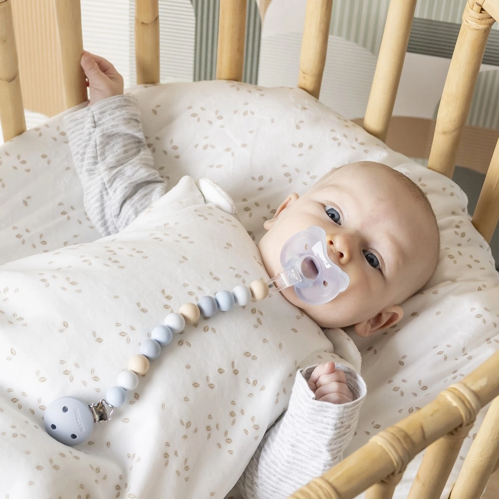 Kovová spona spolehlivě drží na oblečení či spacím pytli, takže dudlík zůstane čistý a vždy po ruce – doma i na procházce.