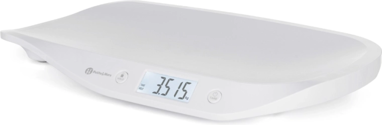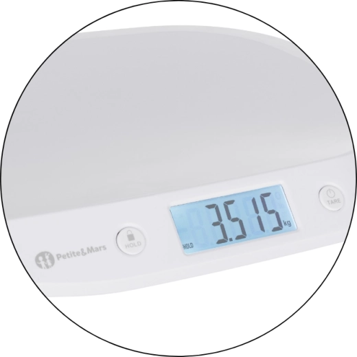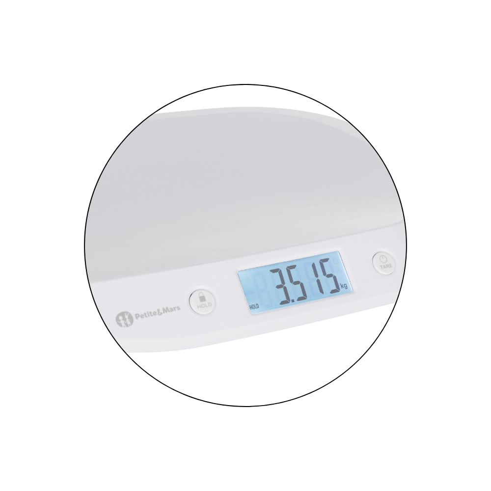 Váha PETITE&MARS Balance je praktickým pomocníkem od prvních dnů života dítěte. Velký, podsvícený LCD displej zaručuje skvělou čitelnost ve dne i v noci, zatímco funkce HOLD (automatická i manuální) zachytí a zobrazí stabilní hodnotu, i když se miminko přirozeně pohybuje. Díky funkci TARE snadno odečtete hmotnost ručníku či dečky a získáte přesný výsledek.