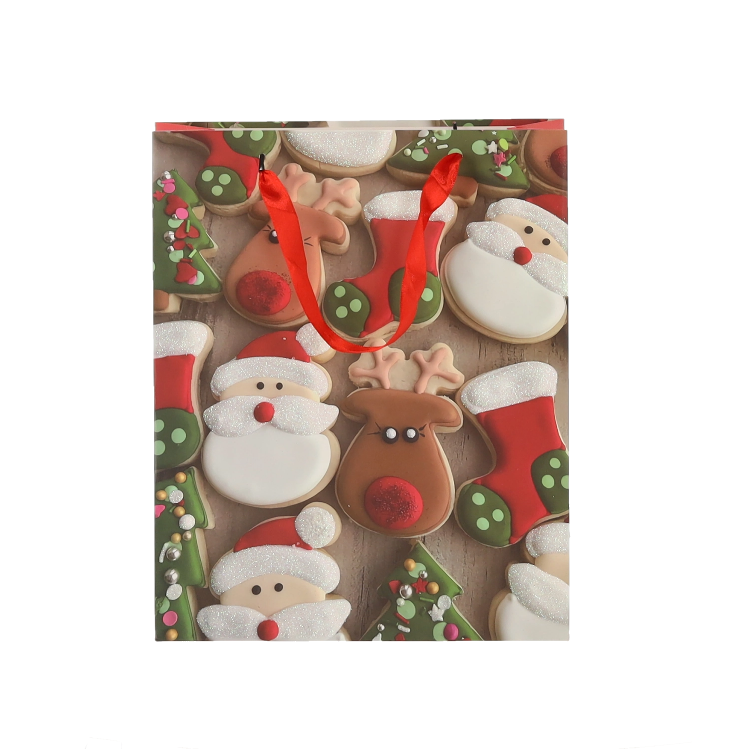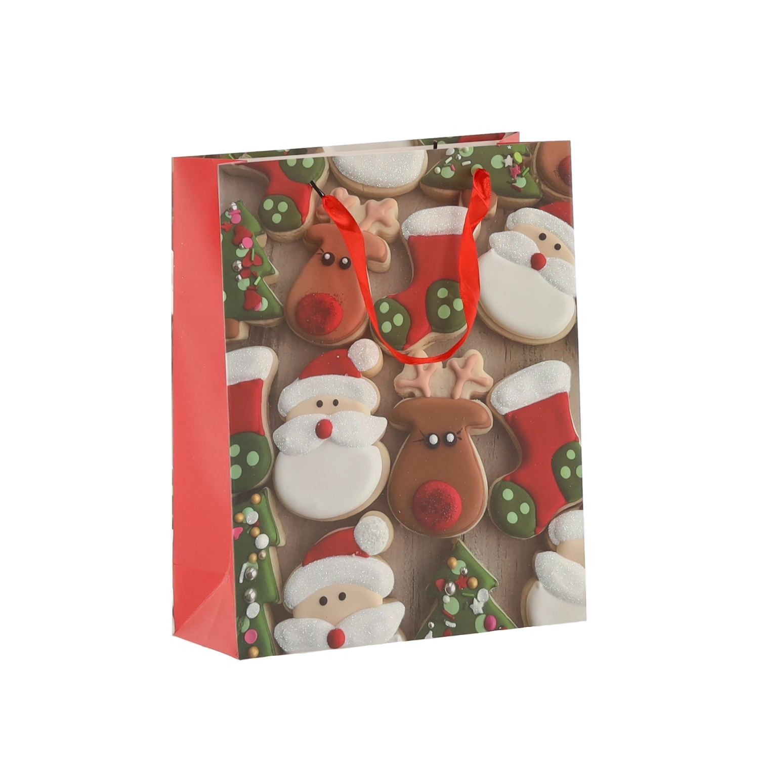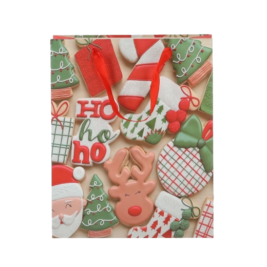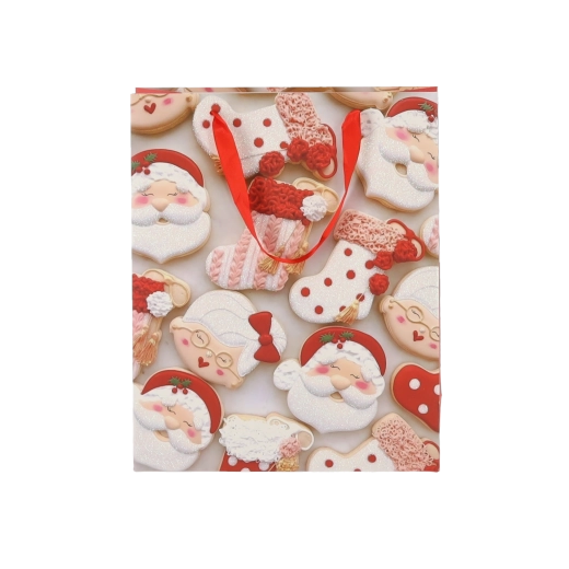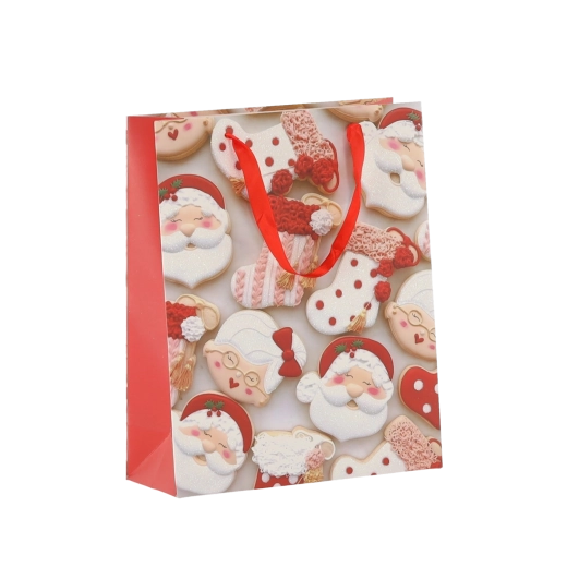 Praktická sada 12 ks vánočních dárkových tašek v rozměru 18 × 24 × 8 cm pro rychlé a stylové balení menších dárků. Tašky z kvalitního papíru s gramáží 157 g/m² jsou pevné a odolné, mají červené stužkové ucho pro pohodlné nošení a veselý potisk s motivy vánočního cukroví – Santa, sob, stromky či rukavice. Ideální pro kosmetiku, šperky a menší knihy.
