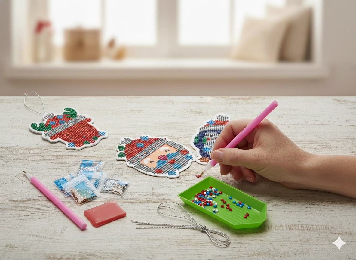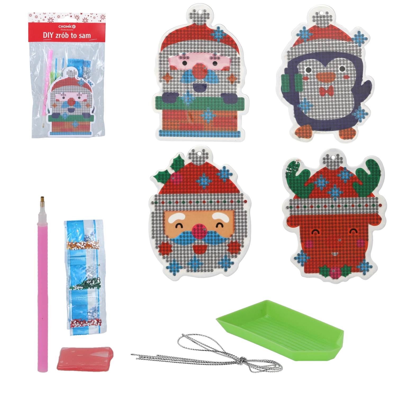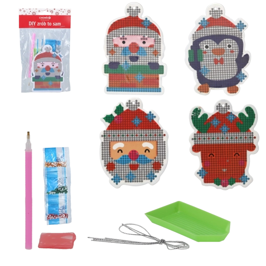 Ideální jako kreativní dárek a společná aktivita pro celou rodinu. Mix vánočních motivů (Santa, sob, tučňák) potěší děti i dospělé a poskytne uklidňující relax i radost z tvoření. Ozdoby lze zavěsit na stromeček, pověsit do okna nebo použít jako originální přívěsky na dárky.