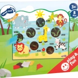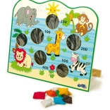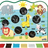 Hrací deska s barevnými ilustracemi zvířat a barevné pytlíčky dělají hru atraktivní a zábavnou pro děti.