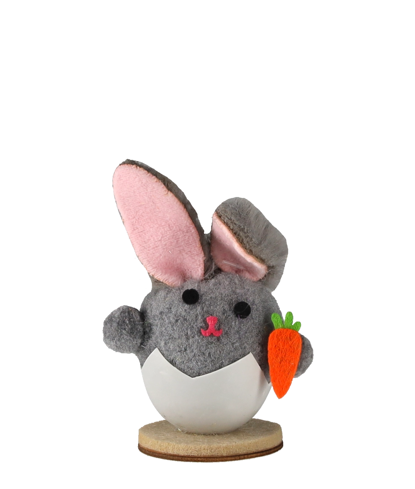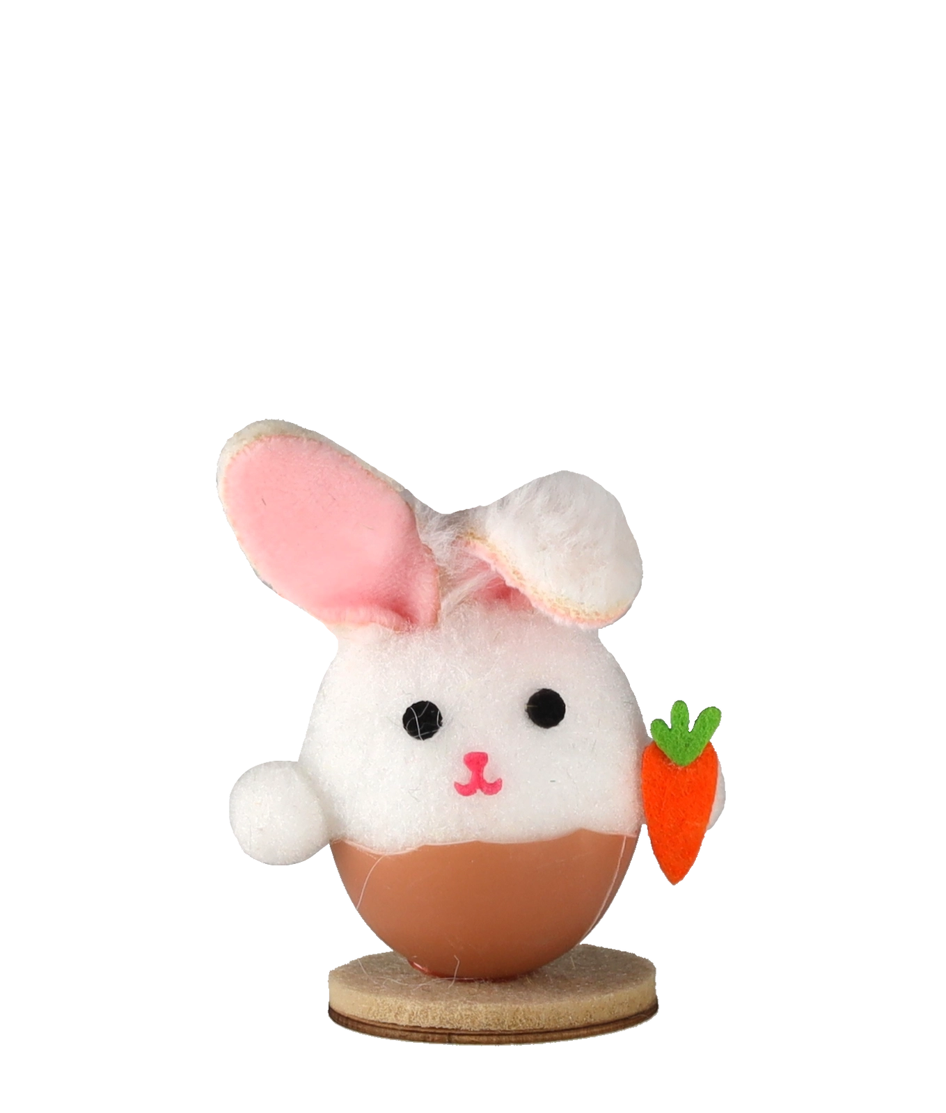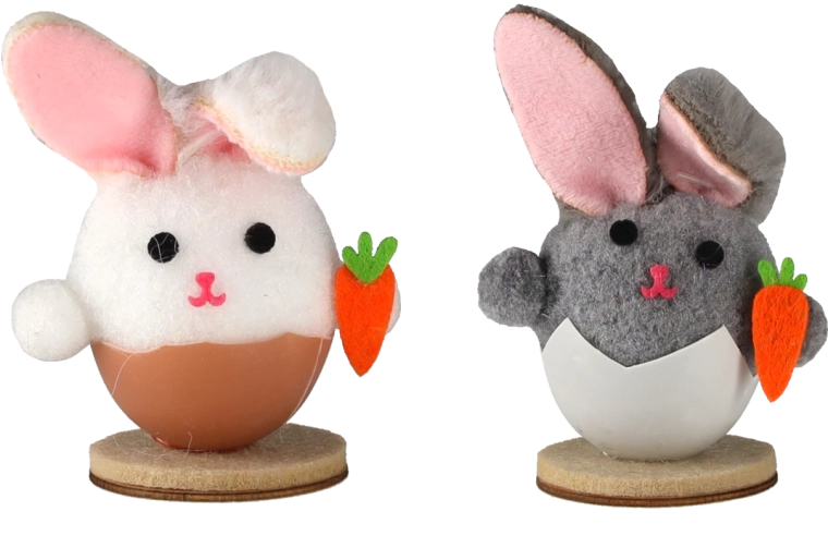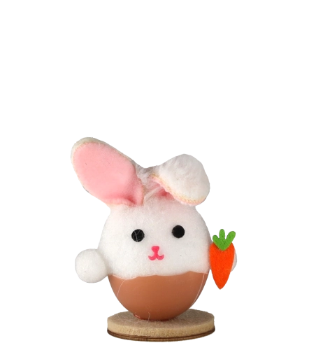 Tato půvabná velikonoční dekorace zobrazuje králíčka vykukujícího z vajíčkové skořápky – symbolu nového života a jara. Jemné barvy, měkký textilní povrch a realistické detaily (tlamička, ouška, mrkvička) z ní dělají okouzlující doplněk pro každý interiér.