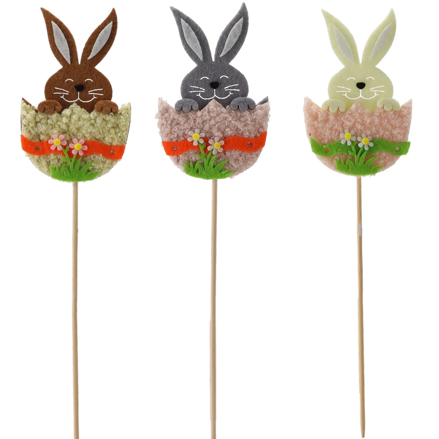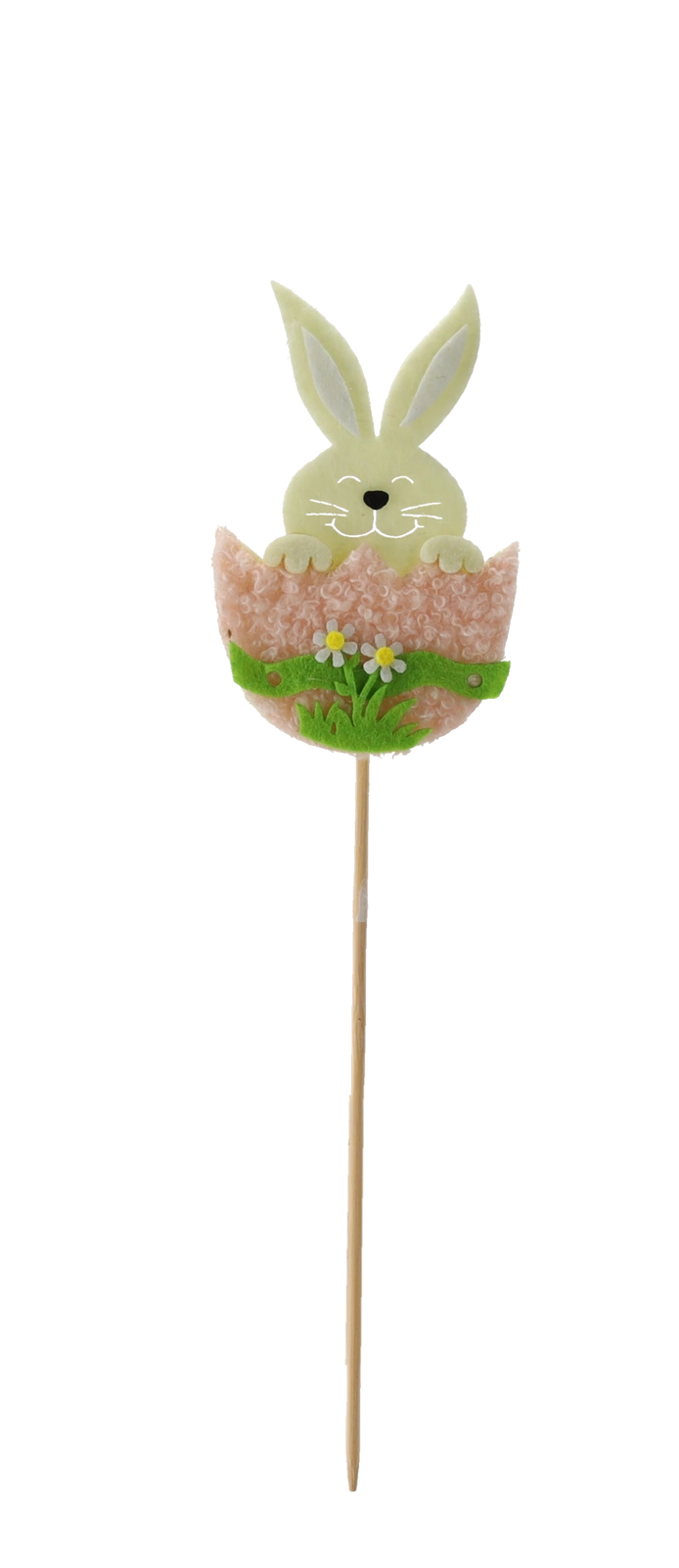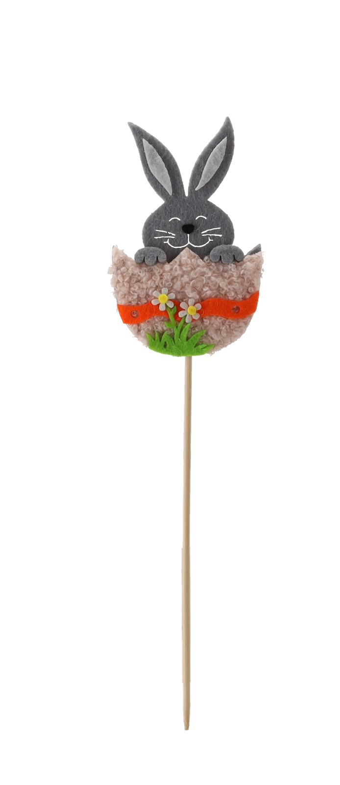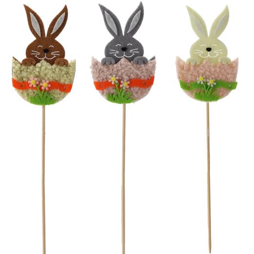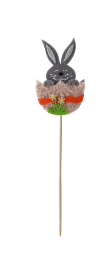Vytvořte si doma sváteční náladu s roztomilým zajíčkem ve skořápce na dřevěné špejli. Dekorace je lehká, stabilní a skvěle drží v substrátu i floristické hmotě. Mix tří barev umožňuje kreativní kombinace v jarních a velikonočních aranžmá.