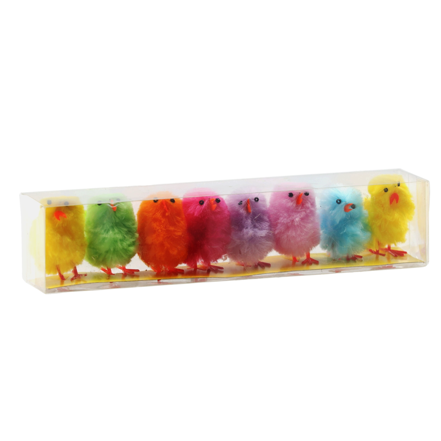 Roztomilá sada 8 velikonočních kuřátek v pestrých barvách rozzáří váš domov během svátků. Každé kuřátko má měkký, chlupatý povrch a stojí na drobných nožkách, takže je ideální na stůl, parapet i velikonoční aranžmá. Díky kompaktním rozměrům je snadno zkombinujete s věnci, košíky či květinami a díky kvalitnímu zpracování je využijete opakovaně každý rok.