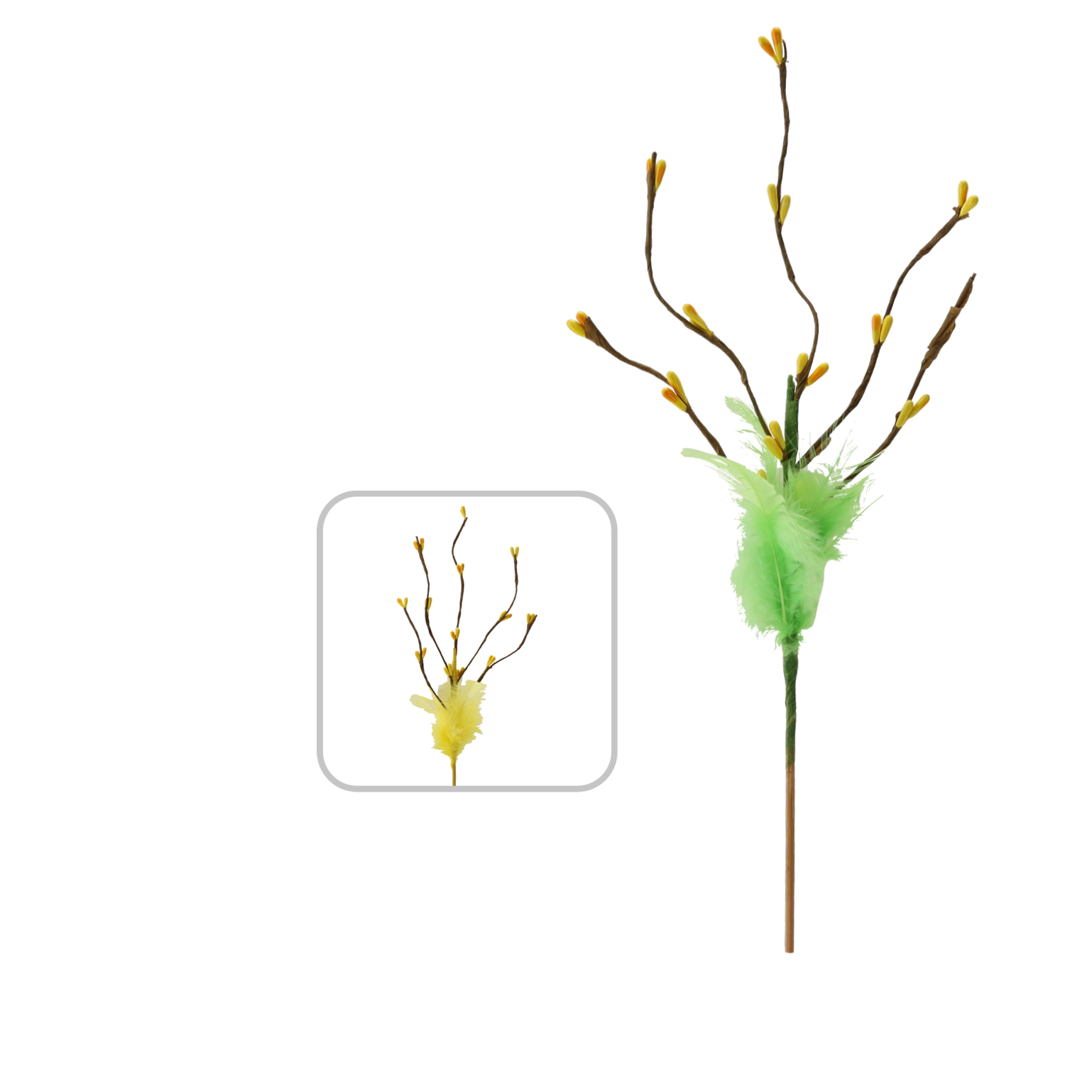 Elegantní velikonoční větvička na piku o délce 32 cm je stylovým doplňkem pro vaše sváteční aranžmá. Skvěle vynikne ve vázách, květinových dekoracích i košících. Disponuje dvěma barevnými variantami pro snadné sladění s výzdobou. Je vyrobena z kvalitních syntetických materiálů, které zajišťují dlouhou životnost a odolnost, a díky lehké konstrukci se s ní velmi snadno pracuje.