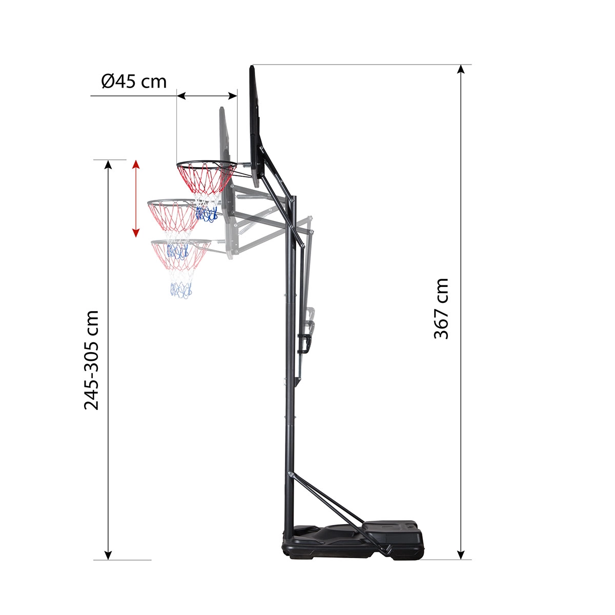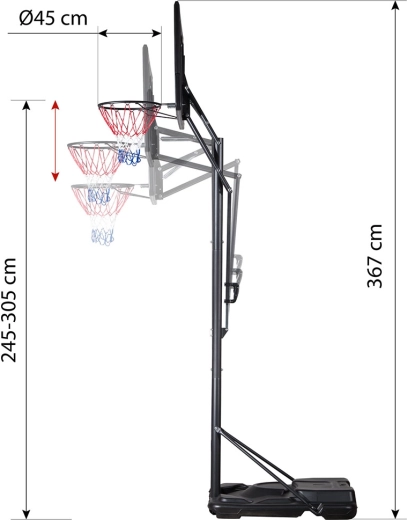 - Nastavitelná výška obruče 2,45–3,05 m ve 5 úrovních