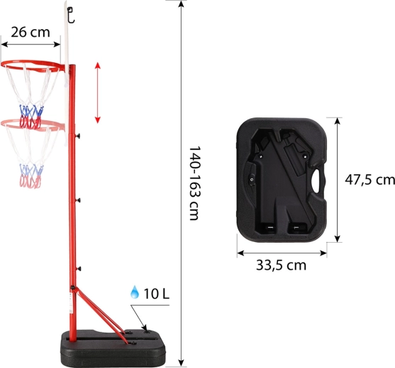 Díky plnitelné základně (10 l) je koš stabilní, ale zároveň snadno přemístitelný. Kompaktní rozměry desky 46,5 × 32,5 cm a lehká konstrukce 3,2 kg usnadňují manipulaci i skladování. Perfektní vybavení pro malé basketbalisty, kteří chtějí trénovat přesnost a zlepšovat své dovednosti.
