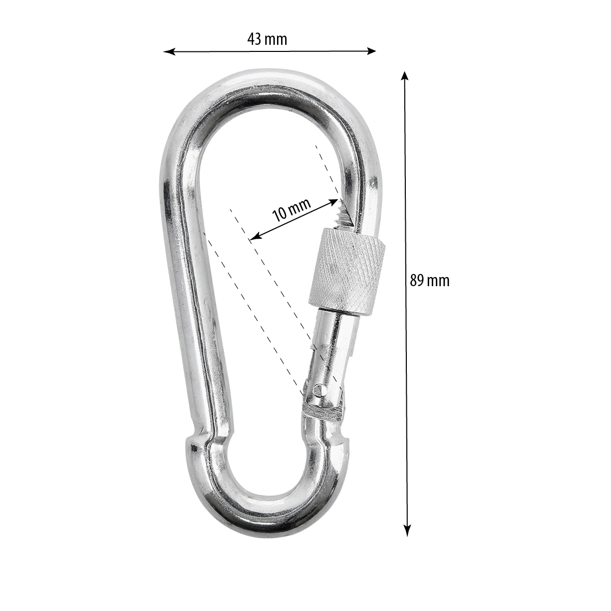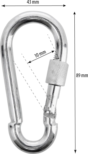 Díky rozměrům 8,9 × 4,3 cm a průvlaku 10 mm je ideální pro všestranné použití – od zavěšení výstroje, upevnění lanek a řetízků až po organizaci nářadí. Odolná povrchová úprava chrání proti korozi a opotřebení.