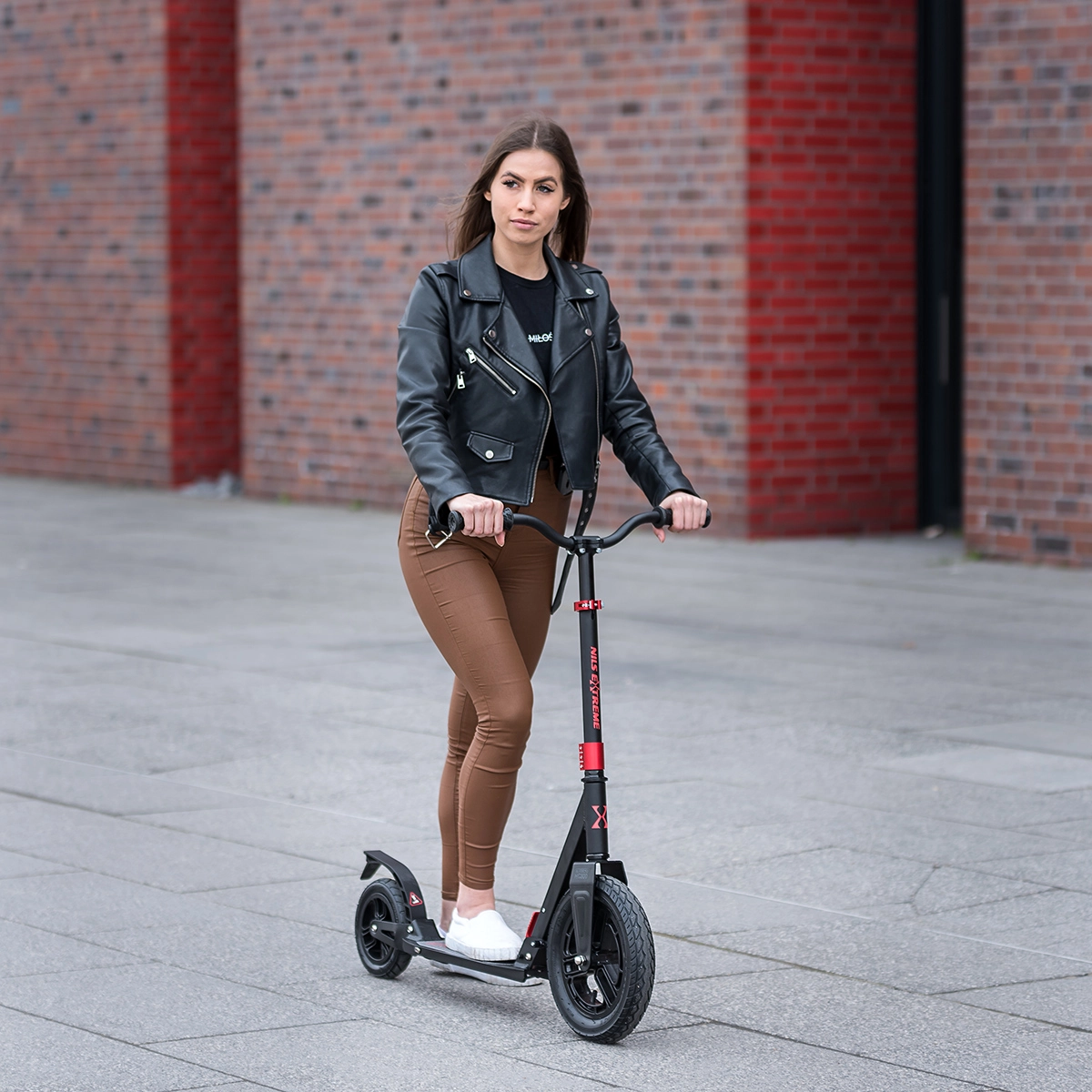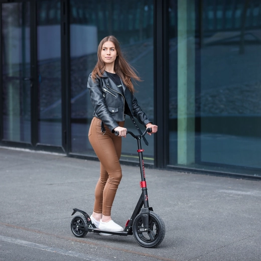 Přední kolo 300 mm a zadní 200 mm s pneumatikami výborně tlumí vibrace na kostkách i nerovném asfaltu a zajišťují tichou, plynulou jízdu po městě.