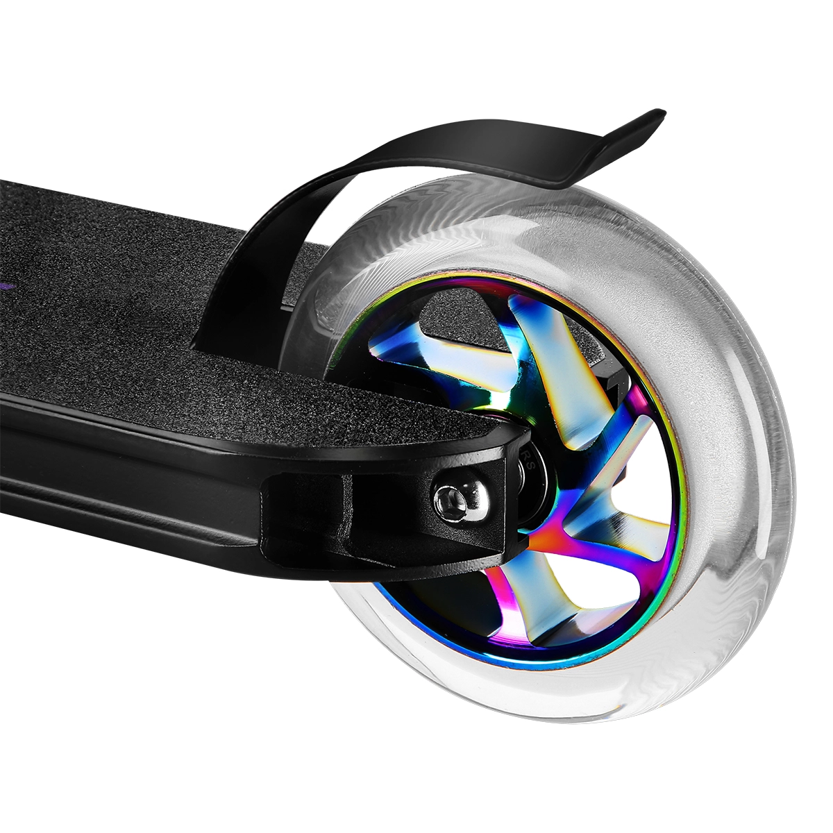 Výkonná freestyle koloběžka pro skatepark i ulice. Díky pevné hliníkové desce, ocelovým řídítkům a ložiskům ABEC 9 nabízí rychlou, plynulou jízdu a vysokou odolnost. Kolečka 110 mm s hliníkovým středem, IHC hlavové složení a zadní brzda flex fender zajišťují jistotu při tricích i každodenním ježdění.