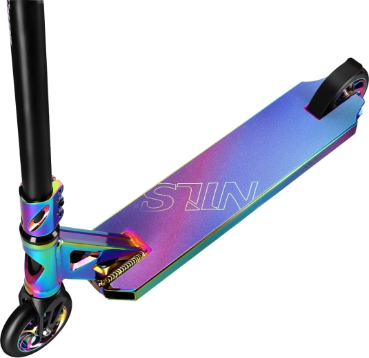 Koloběžka NILS Extreme HS014 Pro je navržená pro skatepark, U-rampu i městské ježdění. Tříkomorový hliníkový deck v neochromovém provedení a široká bezzávitová řídítka s gumovými gripy zajišťují stabilitu, kontrolu a pevný úchop. Díky systému IHC s lisovaným nábojem je řízení přesné a odolné s možností 360° otáčení řídítek.