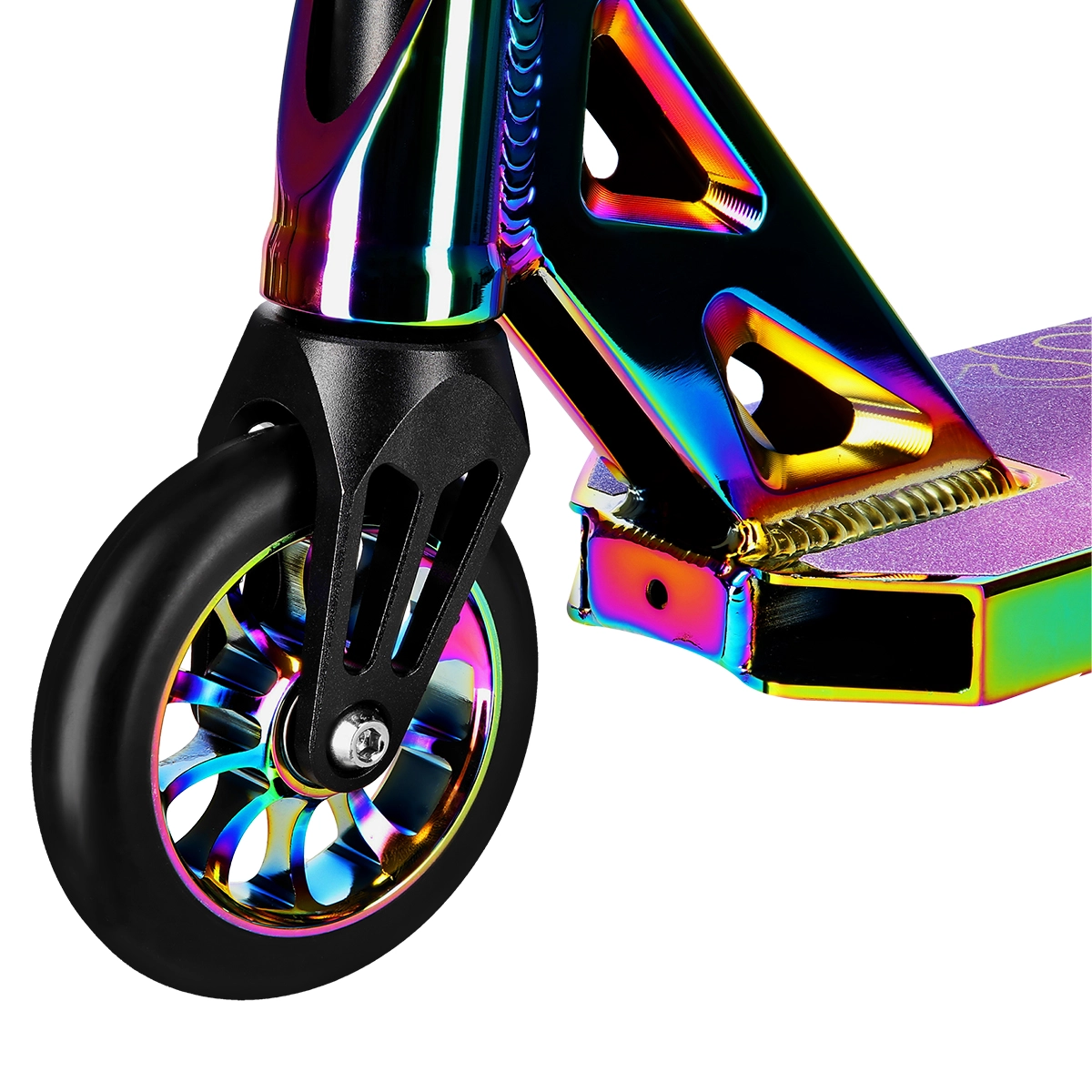 Odolná freestylová koloběžka pro děti, mládež i dospělé s pevným hliníkovým deckem a ocelovými řídítky. Nabízí rychlá kolečka 110 mm s ložisky ABEC 9, bezpečnou zadní brzdu flex fender a robustní konstrukci bez skládacího mechanismu pro jistotu při tricích.