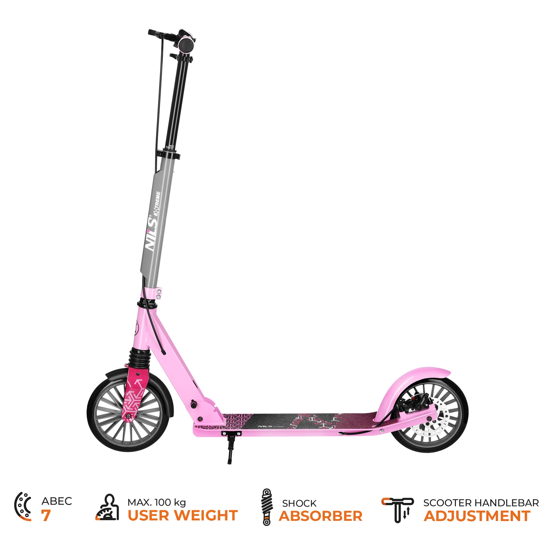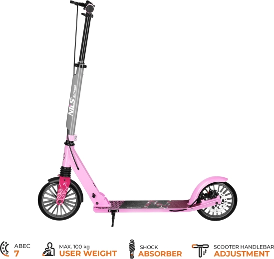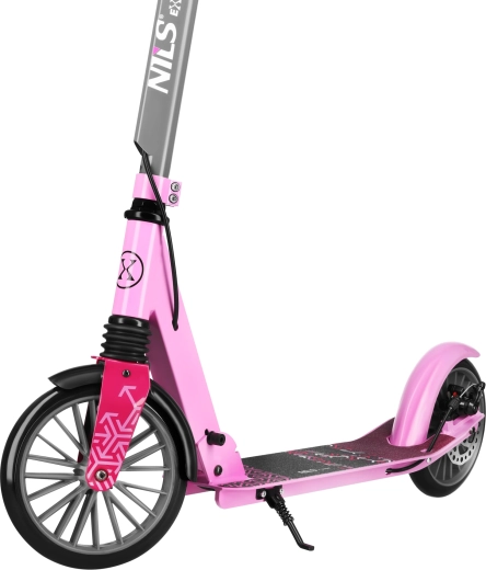 Koloběžka NILS Extreme LUMIA je ideální parťák pro každodenní přesuny i volnočasové vyjížďky. Pevná kombinace hliníku a oceli udržuje nízkou hmotnost, zatímco přední odpružení tlumí nerovnosti. Protiskluzový deck a měkké rukojeti zvyšují jistotu a komfort.