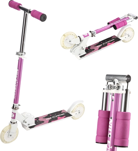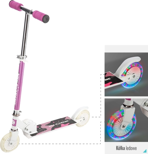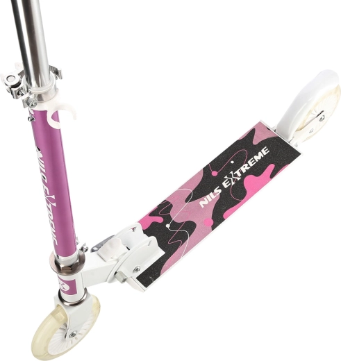Růžová skládací koloběžka NILS Extreme HD505 je navržena pro mladé jezdce, kteří chtějí spojit zábavu, pohodlí a bezpečí. Díky polyuretanovým kolečkům o průměru 120 mm zvládá hladkou a tichou jízdu po rovných površích, zatímco lehké hliníkové tělo a možnost složení usnadňují přenášení i skladování.