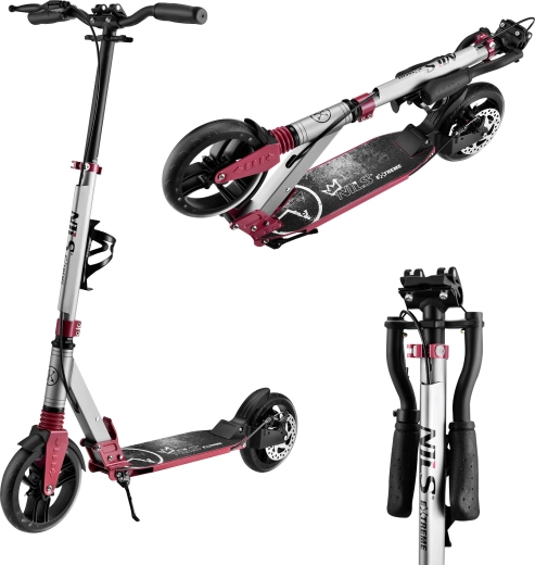 Koloběžka NILS Extreme je ideální volbou pro městské dojíždění i volnočasové projížďky. Díky hliníkové konstrukci váží jen 6,1 kg, přesto unese až 100 kg. Velká polyuretanová kola 200 mm s LED osvětlením a ložiska ABEC 7 zajišťují hladkou, tichou a rychlou jízdu na asfaltu i zpevněných cestách.