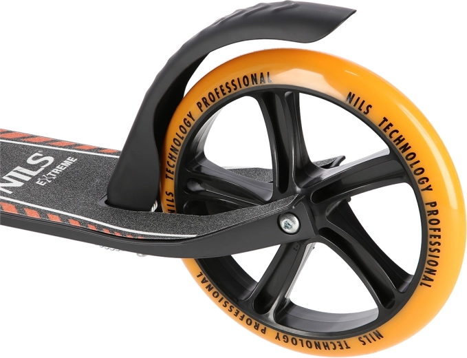 Užijte si plynulou a bezpečnou jízdu s koloběžkou NILS Extreme HM0107. Lehký, přesto pevný hliníkový rám se rychle skládá, takže koloběžku snadno vezmete do MHD nebo uložíte do kufru auta. Velká polyuretanová kola o průměru 200 mm s ložisky ABEC 7 se postarají o rychlý a komfortní přesun po městě.