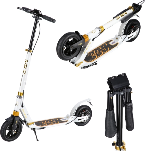 O vaši bezpečnost se stará zadní kotoučová i nášlapná brzda a odrazky pro lepší viditelnost. Nastavitelná řídítka (89–104 cm) a ergonomické gumové gripy přinášejí pohodlí pro jezdce různých výšek. Díky rychlému skládacímu mechanismu, kompaktním rozměrům po složení a odnímatelnému ramennímu popruhu je přenášení i skladování otázkou chvilky.