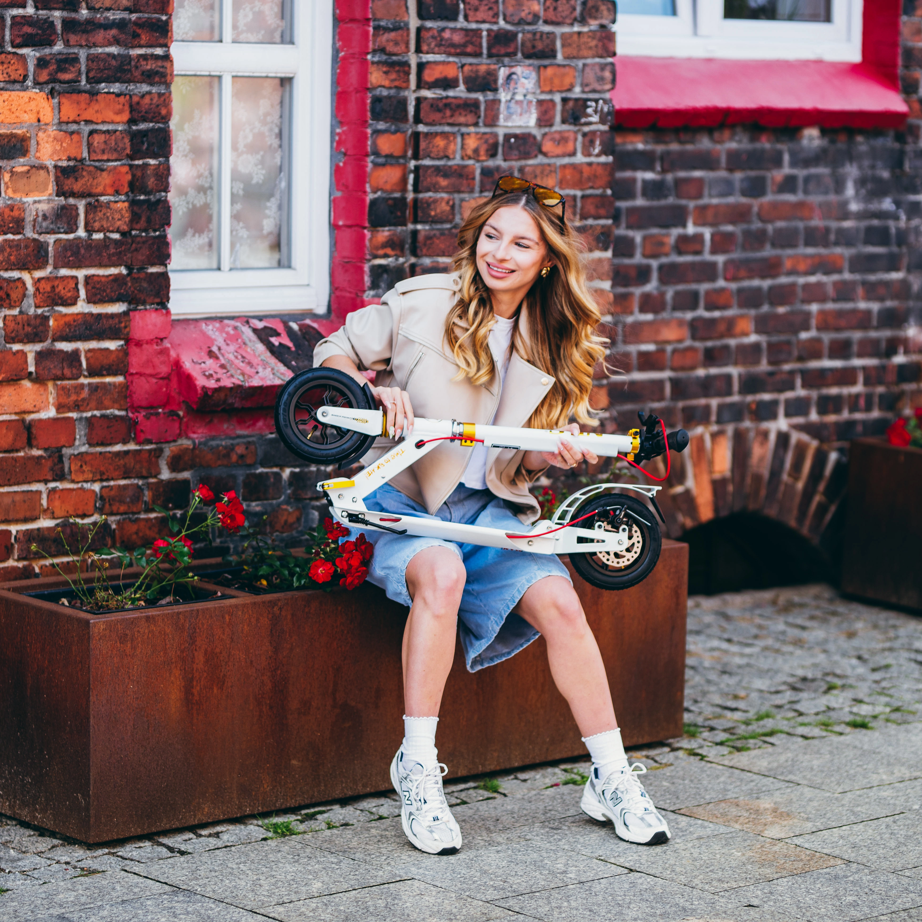 Přední i zadní tlumič v kombinaci s nafukovacími koly 200 mm pohlcují nerovnosti a zvyšují komfort i stabilitu při městském dojíždění.