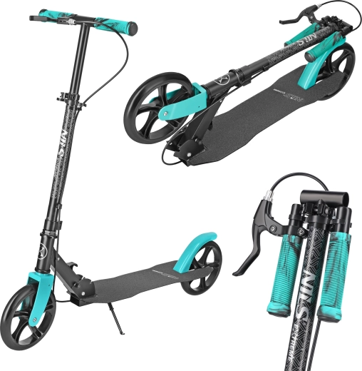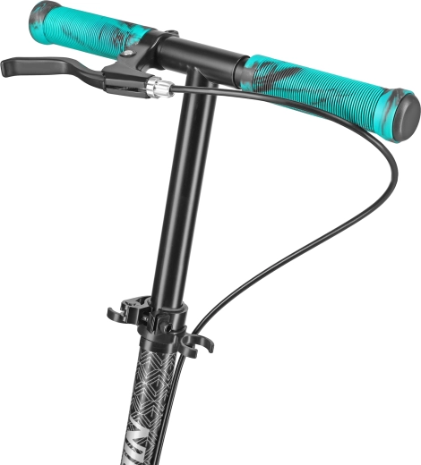 Řídítka s měkkými TPR gripy jsou nastavitelná ve třech polohách (87 / 92 / 97 cm), takže si koloběžku přizpůsobíte své výšce. Bezpečí zvyšuje ruční brzda doplněná o nástupnou zadní brzdu, zatímco integrovaný stojánek usnadní parkování během dne.