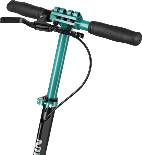 Pro hladkou jízdu na chodnících i horším povrchu je vybavena 200mm PU koly, přesnými ložisky ABEC 9 a odpružením předního kola. Široký protiskluzový deck 46 × 12 cm poskytuje stabilní postoj a ergonomické TPR gripy zaručí jistý úchop. Bezpečnost zvyšuje kombinace zadní nášlapné brzdy a mechanické kotoučové brzdy ovládané z řídítek.