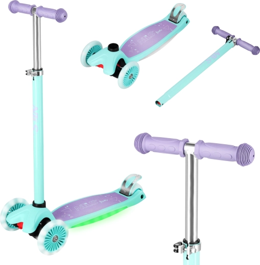 Ovládání je intuitivní díky řízení přenášením váhy – nakloněním řídítek se přední kola zatočí do požadovaného směru. Výškově nastavitelná řídítka (78 / 84 / 90 cm) a pohodlné TPR rukojeti zajistí, že koloběžka roste společně s dítětem. Konstrukce z hliníku, oceli a nylonu je lehounká (2,46 kg) a zároveň odolná, s nosností až 50 kg.