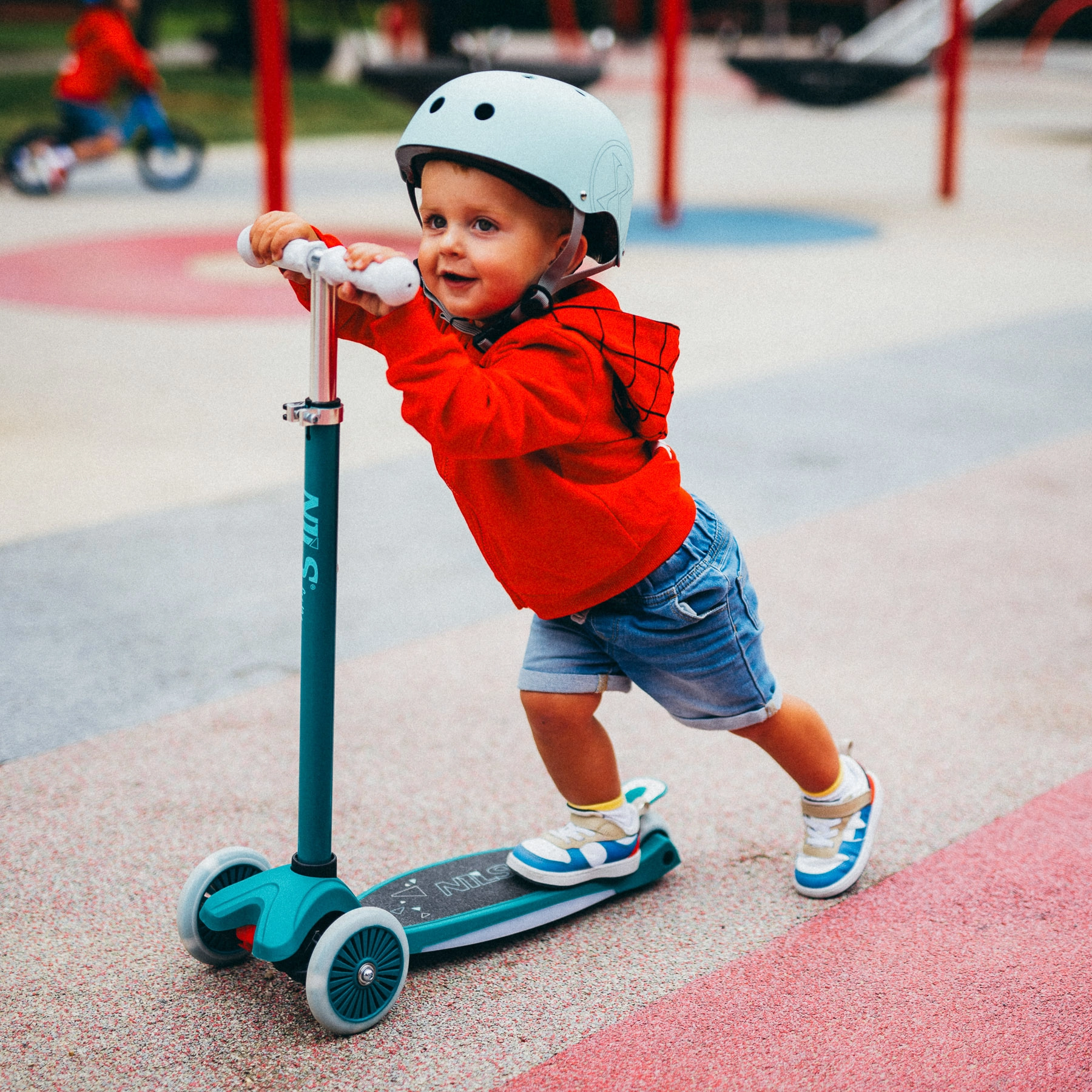 Dvě přední kola a naklápěcí řízení pomáhají dětem bezpečně zatáčet bez přetáčení řídítek. Široká deska a zadní brzda zvyšují kontrolu při jízdě.