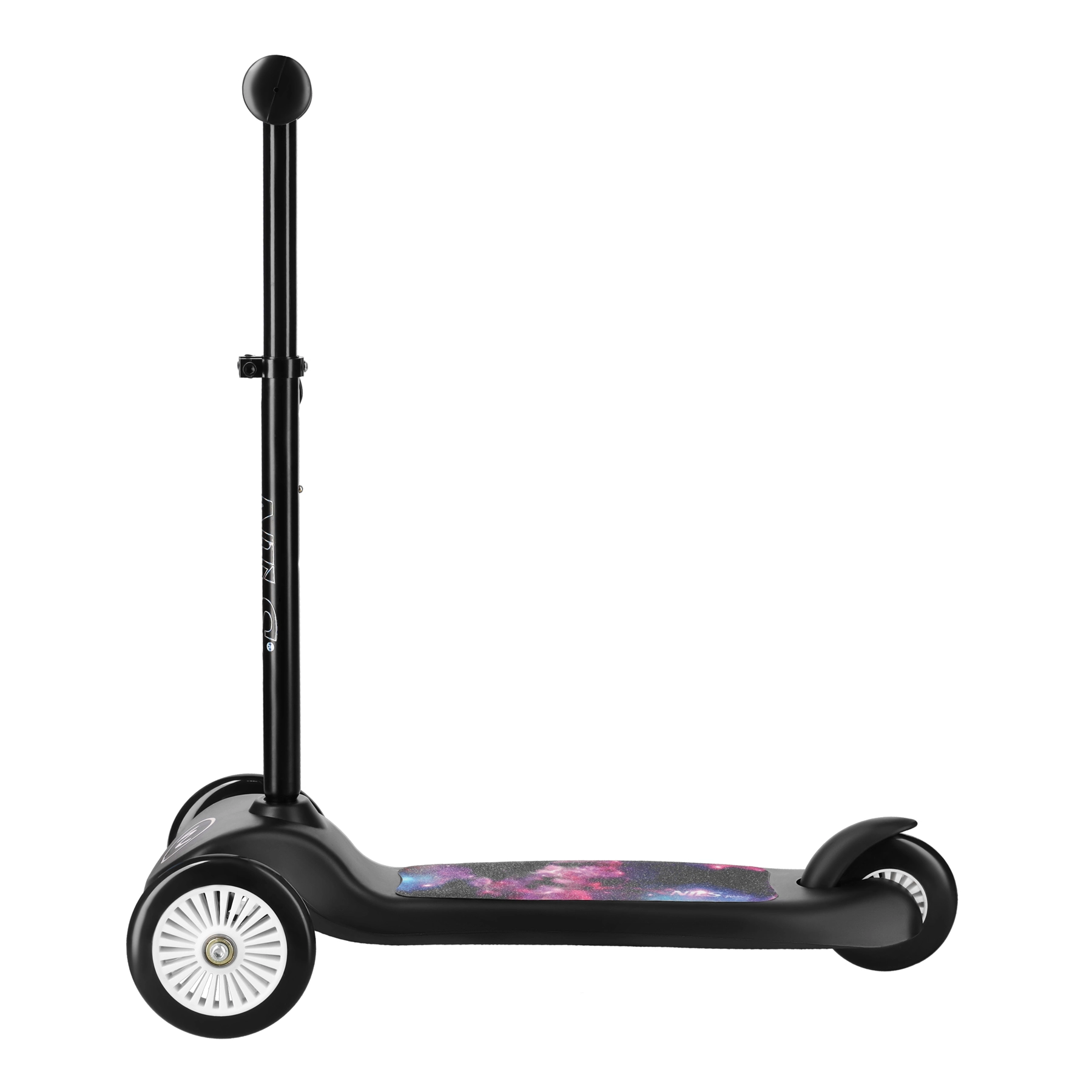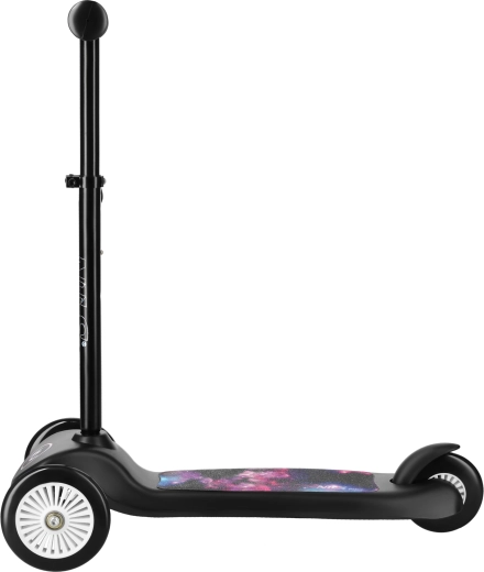 Dek s atraktivním galaktickým motivem, kolečka z odolného PVC a ložiska ABEC 5 přinášejí plynulou jízdu po chodníku i mírně nerovném povrchu. Robustní konstrukce z PP, hliníku a oceli unese až 50 kg, takže koloběžka vydrží dětem celé roky. Díky hmotnosti jen 2,1 kg ji snadno přenesou děti i rodiče.