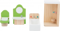 Stylová sada koupelnového nábytku pro domeček pro panenky potěší všechny malé stavitele. Obsahuje sprchový kout, vanu, umyvadlo se zrcadlem a WC v příjemné kombinaci zelené a přírodního dřeva. Je vyrobena z masivního dřeva pro dlouhou životnost a bezpečnou hru. Podporuje fantazii a jemnou motoriku a je vhodná pro ohýbací panenky do 12 cm.