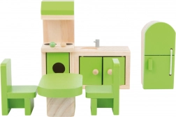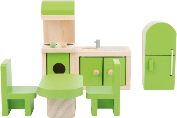Tato detailně zpracovaná kuchyňská sada pro domečky nabízí vše, co malí kuchaři potřebují – dřez, sporák, lednici, stůl a dvě židličky v příjemné kombinaci přírodního dřeva a svěžích zelených akcentů. Díky masivnímu dřevu je nábytek stabilní a připravený na každodenní hraní.
