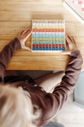 Barevné dřevěné kostky s příklady motivují děti k objevování a opakování násobilky každý den.