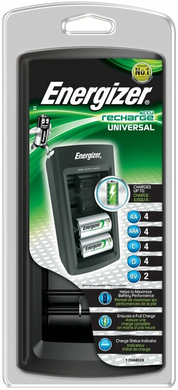 Hledáte jednu nabíječku pro všechny vaše dobíjecí baterie? Univerzální nabíječka ENERGIZER zvládne najednou velikosti AA, AAA, C, D i 9V, takže pokryje potřeby dálkových ovladačů, hraček, svítilen i audio techniky. Díky chytré elektronice s automatickým ukončením nabíjení po přibližně 3–5 hodinách chrání baterie a prodlužuje jejich životnost.